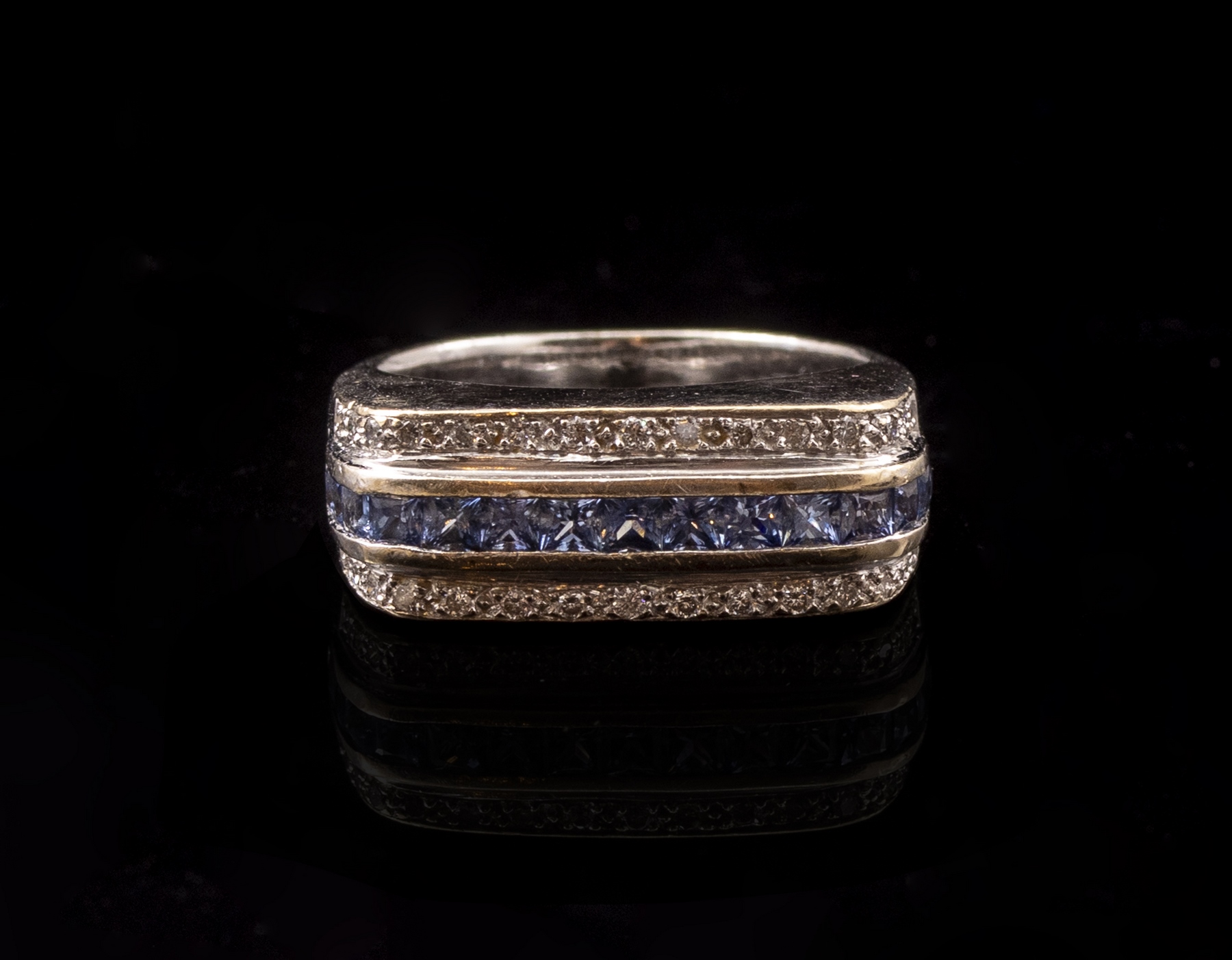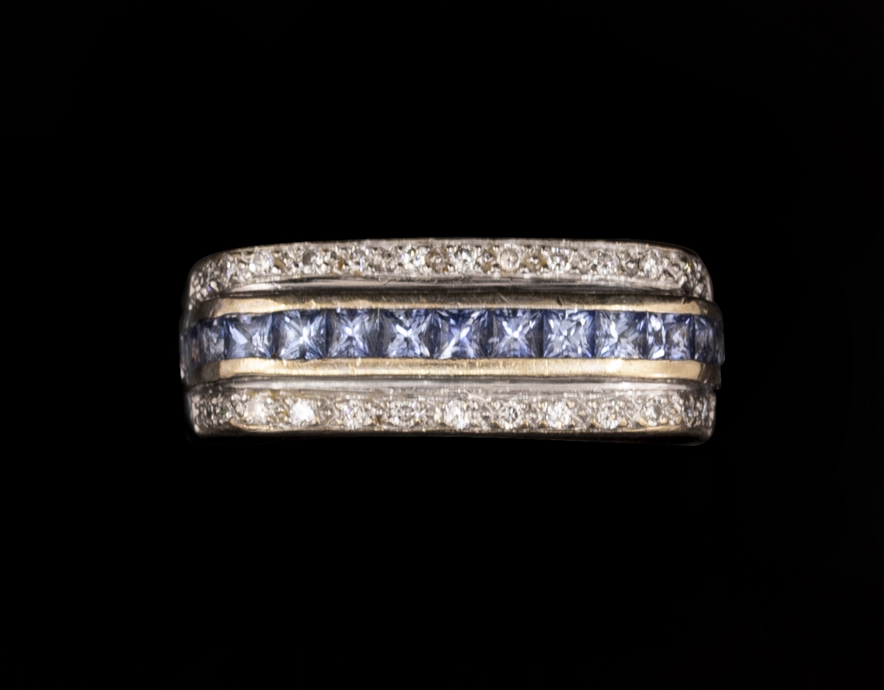 טבעת זהב לבן 18K משובצת 29 יהלומים במשקל של כ-1 נק’ כ”א ו- 15 ספירים. מידה: 1/4 6 US, משקל: 9.3 גרם. לא חתומה, הזהב נבדק.