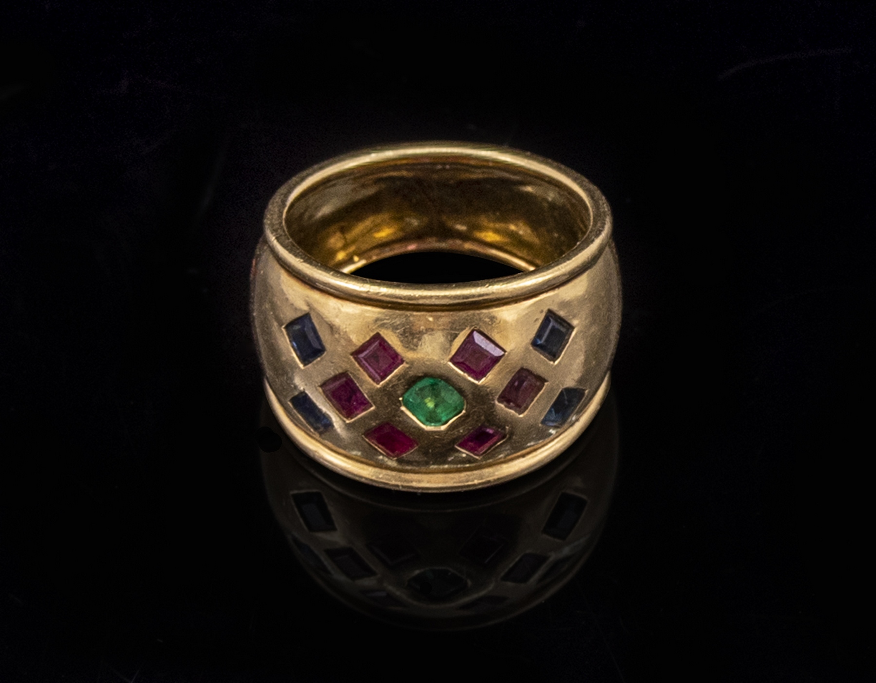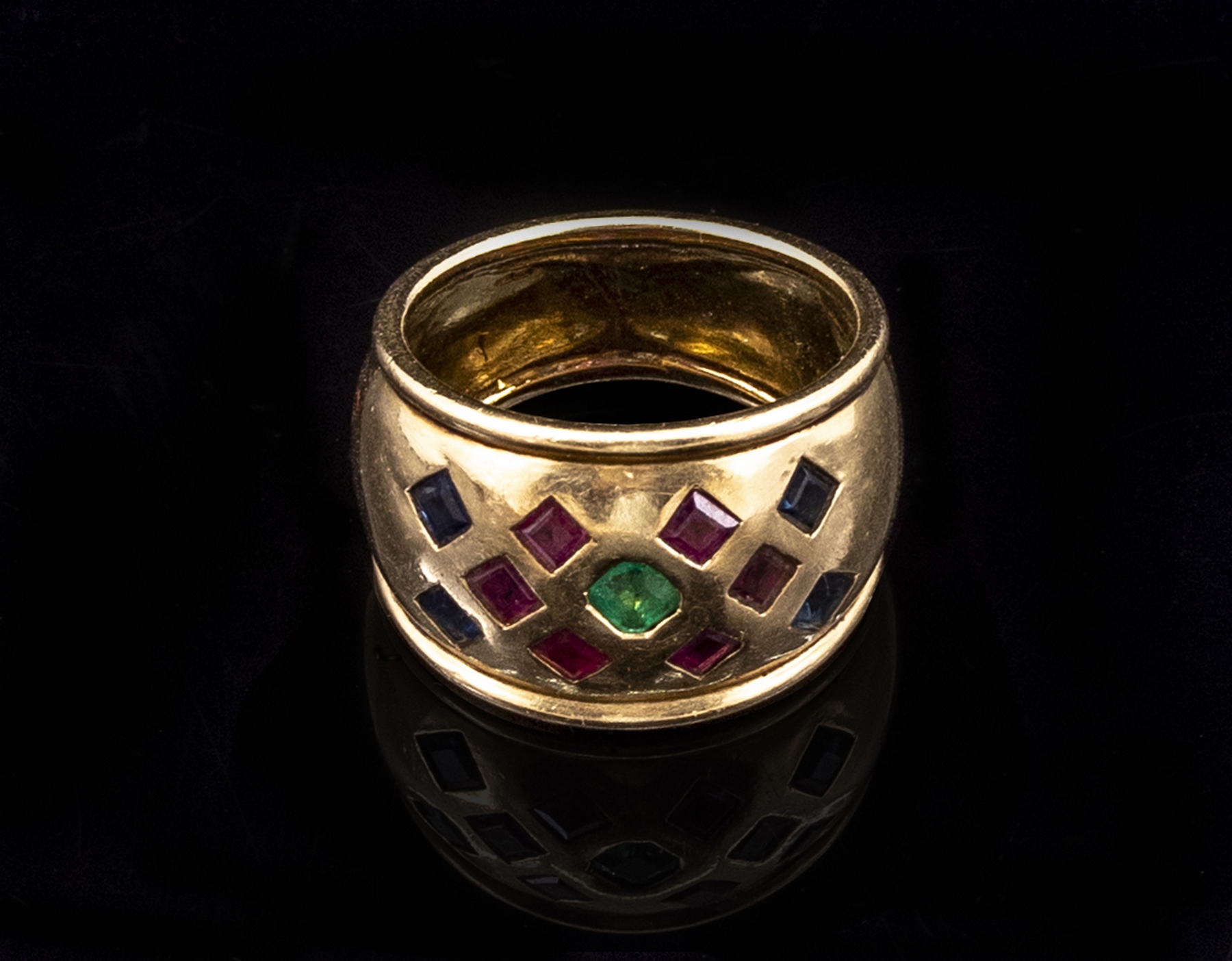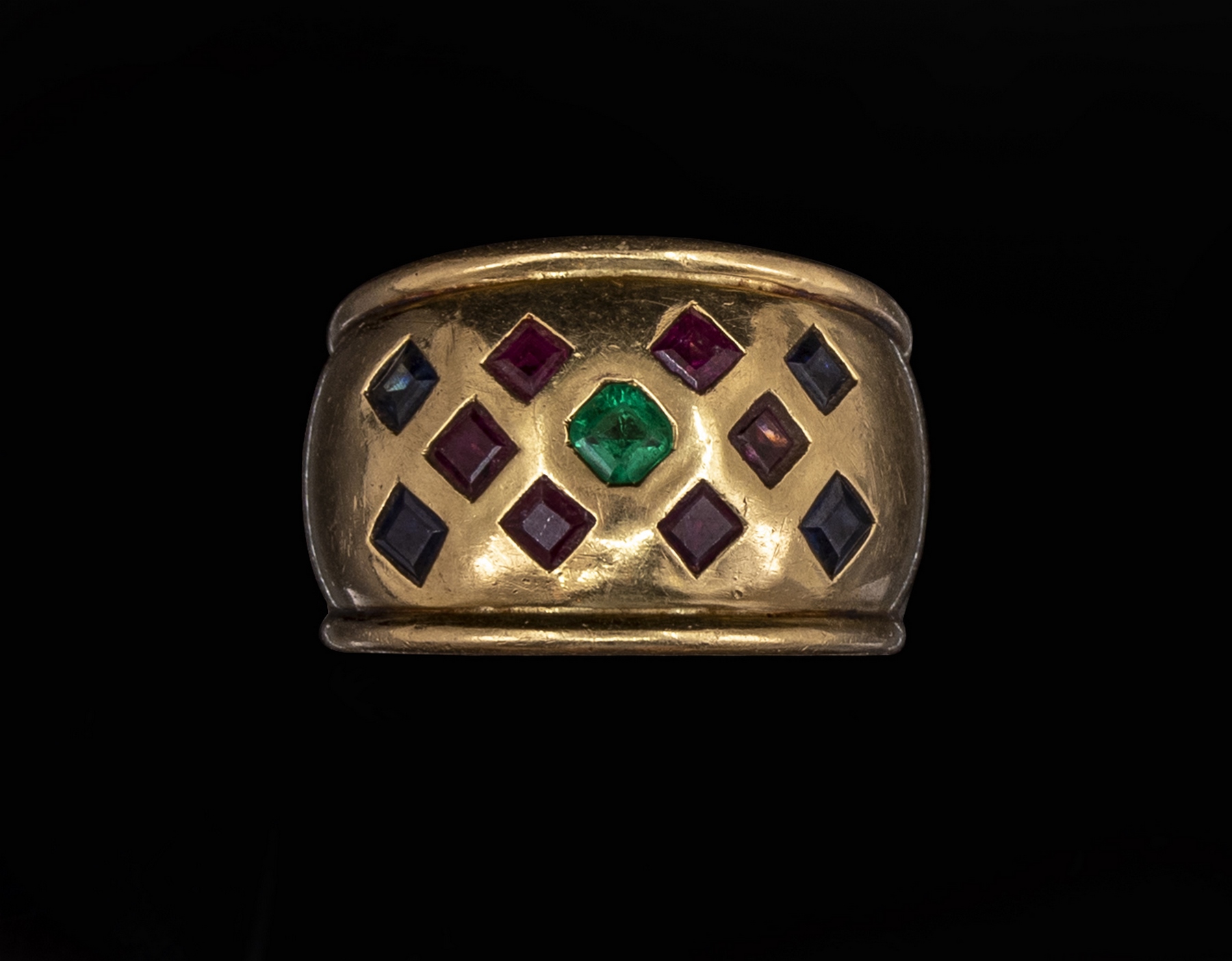 טבעת זהב 18K. משובצת אמרלד, רובינים וספירים. מידה: 6 US, משקל: 8.3 גרם. לא חתומה, זהב נבדק.