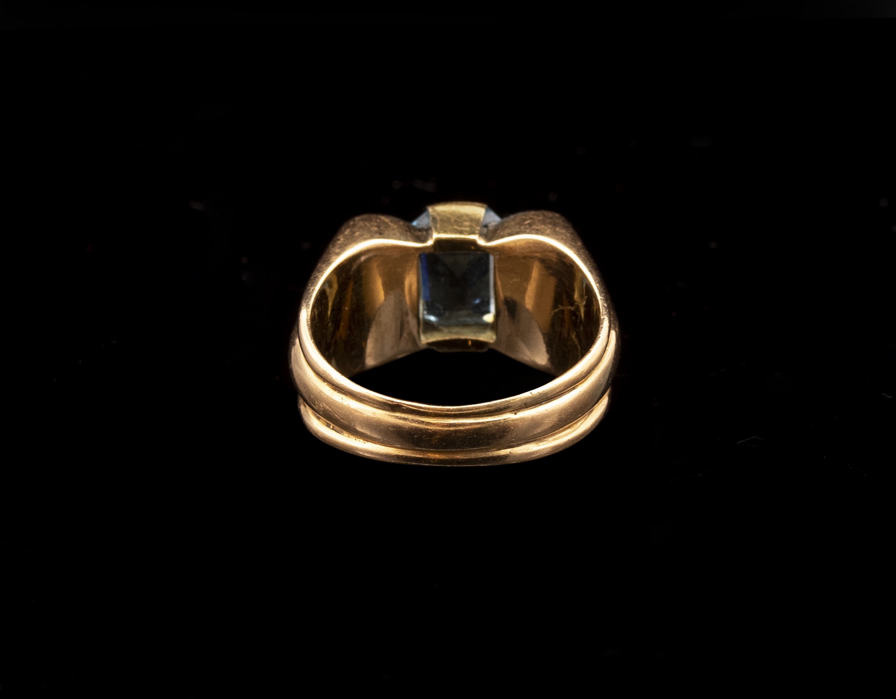 טבעת זהב 18K, משובצת בלו טופז מרכזית (9X7 מ”מ) ומסביב דיאמנטים. מידה: 9.5 US, משקל: 8.4 גרם. חתומה. סדק זעיר לזהב.