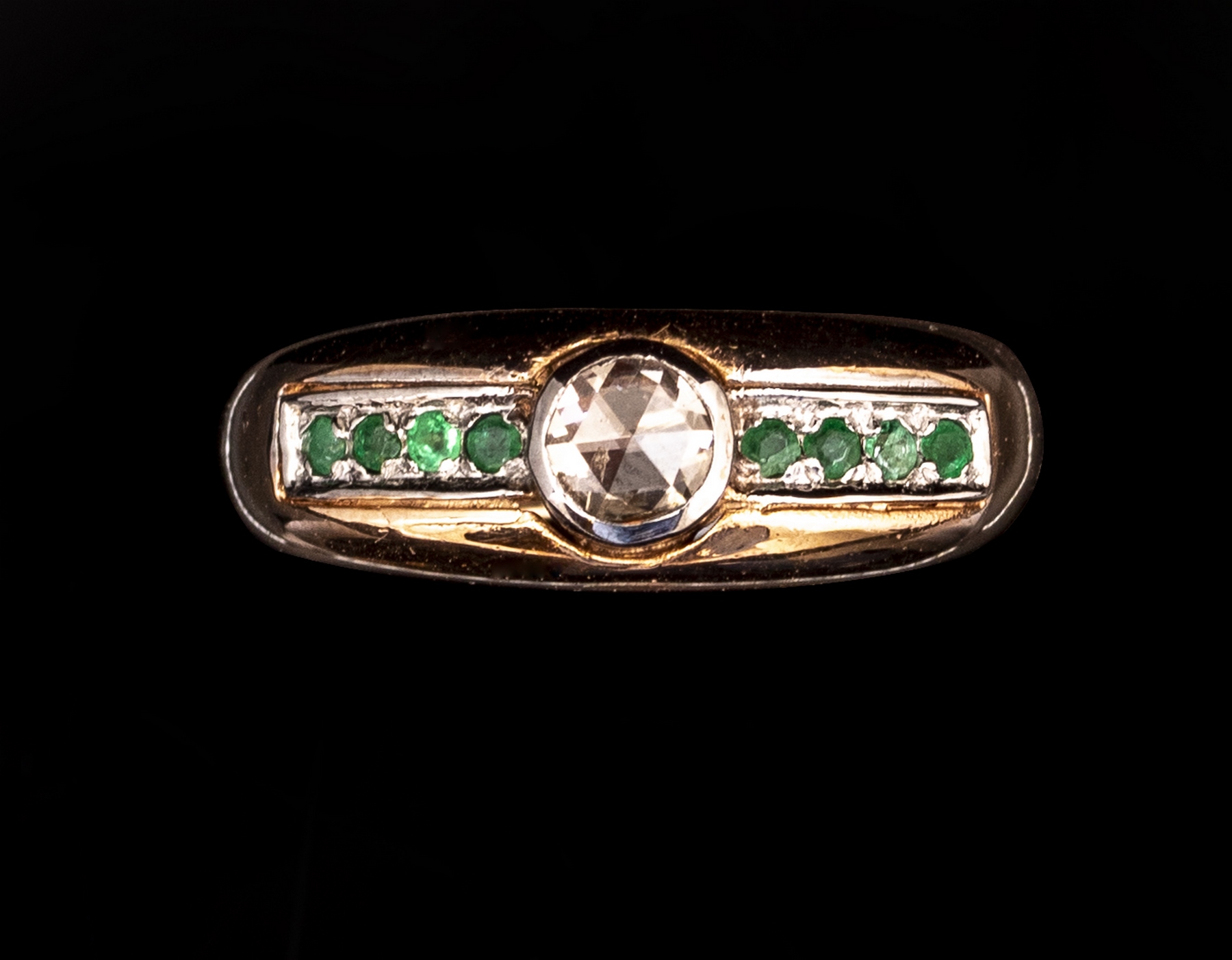 טבעת זהב 14K משובצת דיאמנט מרכזי ו-10 אמרלדים זעירים מצדדיו. מידה: 6.5 US, משקל: 4.5 גרם. חתומה.