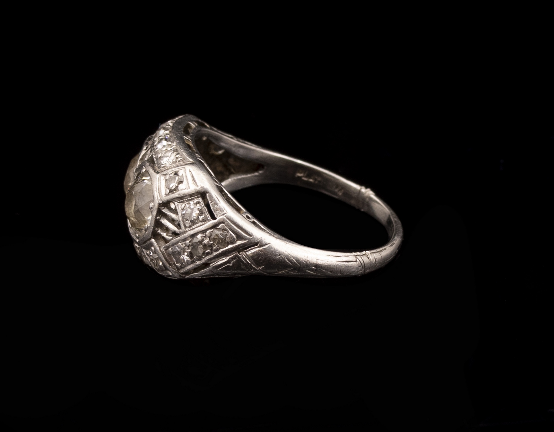 טבעת פלטינה אר-דקו, משובצת 2 יהלומים בחיתוך אלט-שליף במשקל כ-חצי קראט כ”א, וכ-20 יהלומים במשקל כ-1 נק’ כ”א. סה”כ כ-1.2 קראט יהלומים. מידה: 7 US, משקל: 5.2 גרם. לא חתומה פלטינה נבדקה.