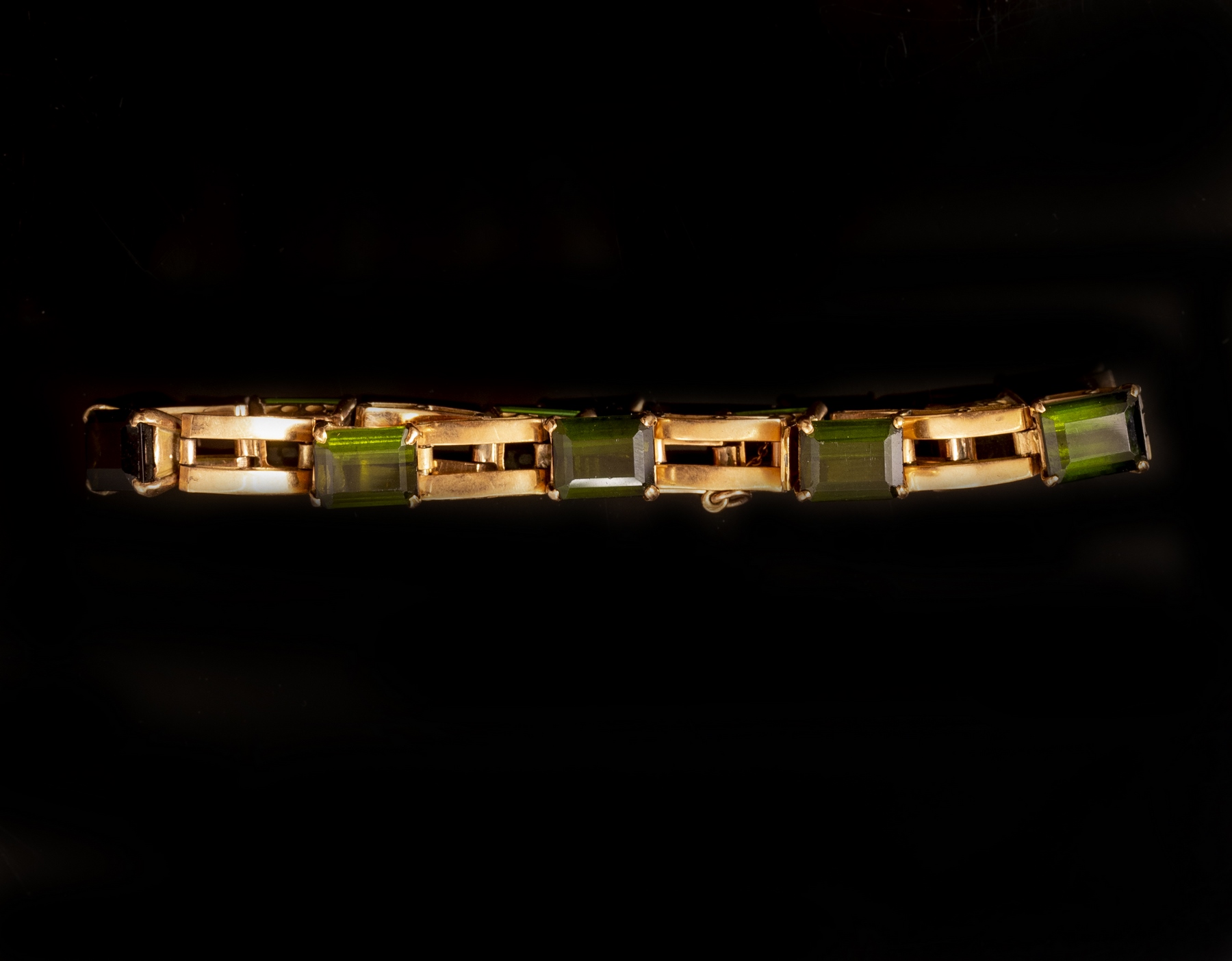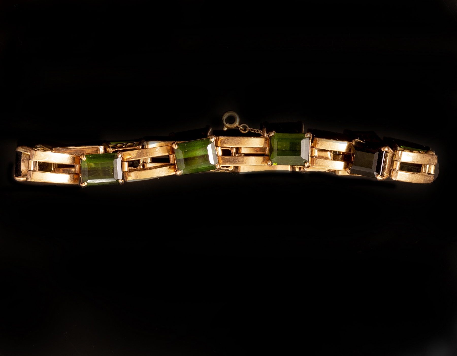 צמיד זהב 14K עשוי חוליות. משובץ 9 אבנים ירוקות (9X7 מ”מ) אורך: 19 ס”מ, רוחב: 7 מ”מ. משקל: 20 גרם. חתום.