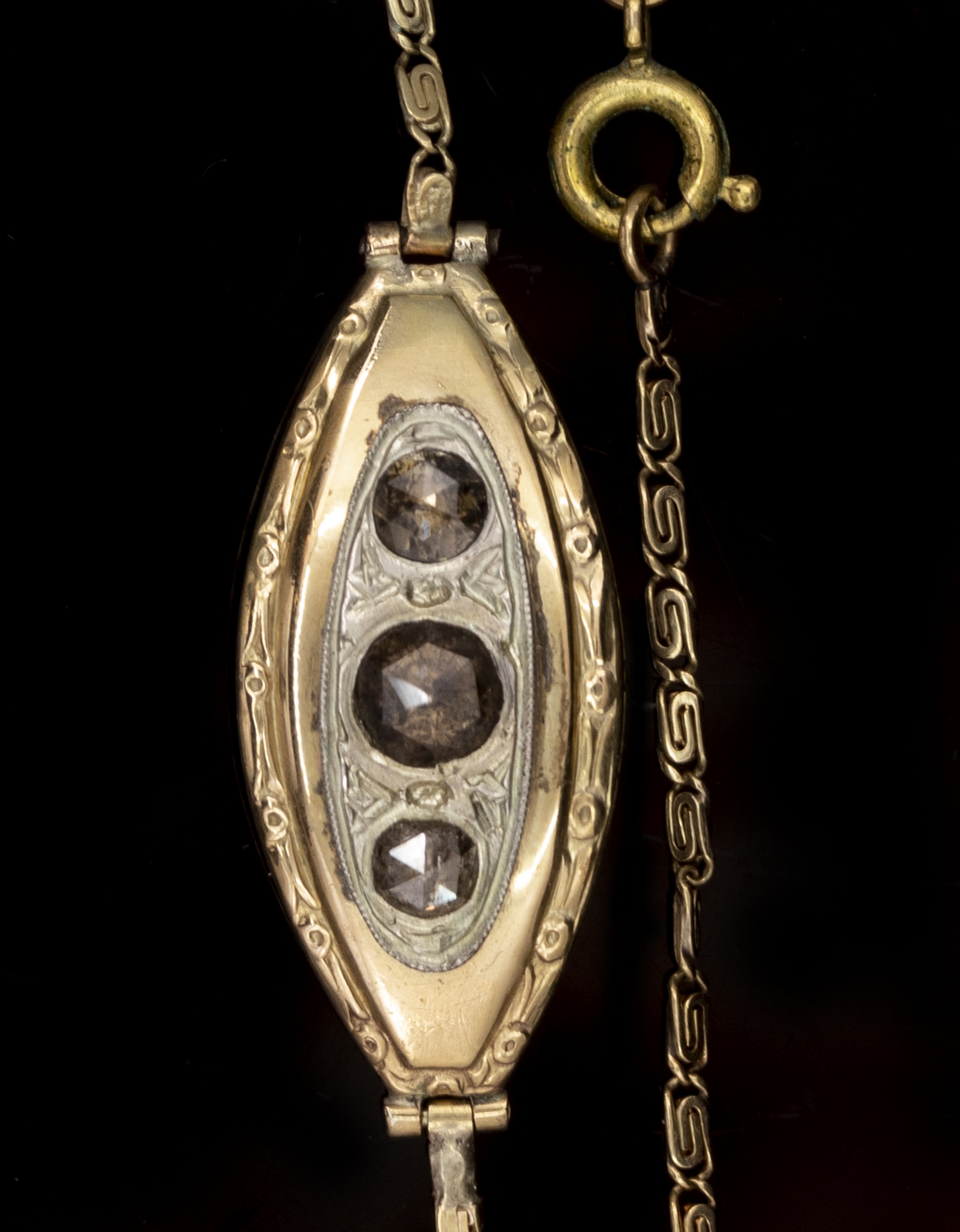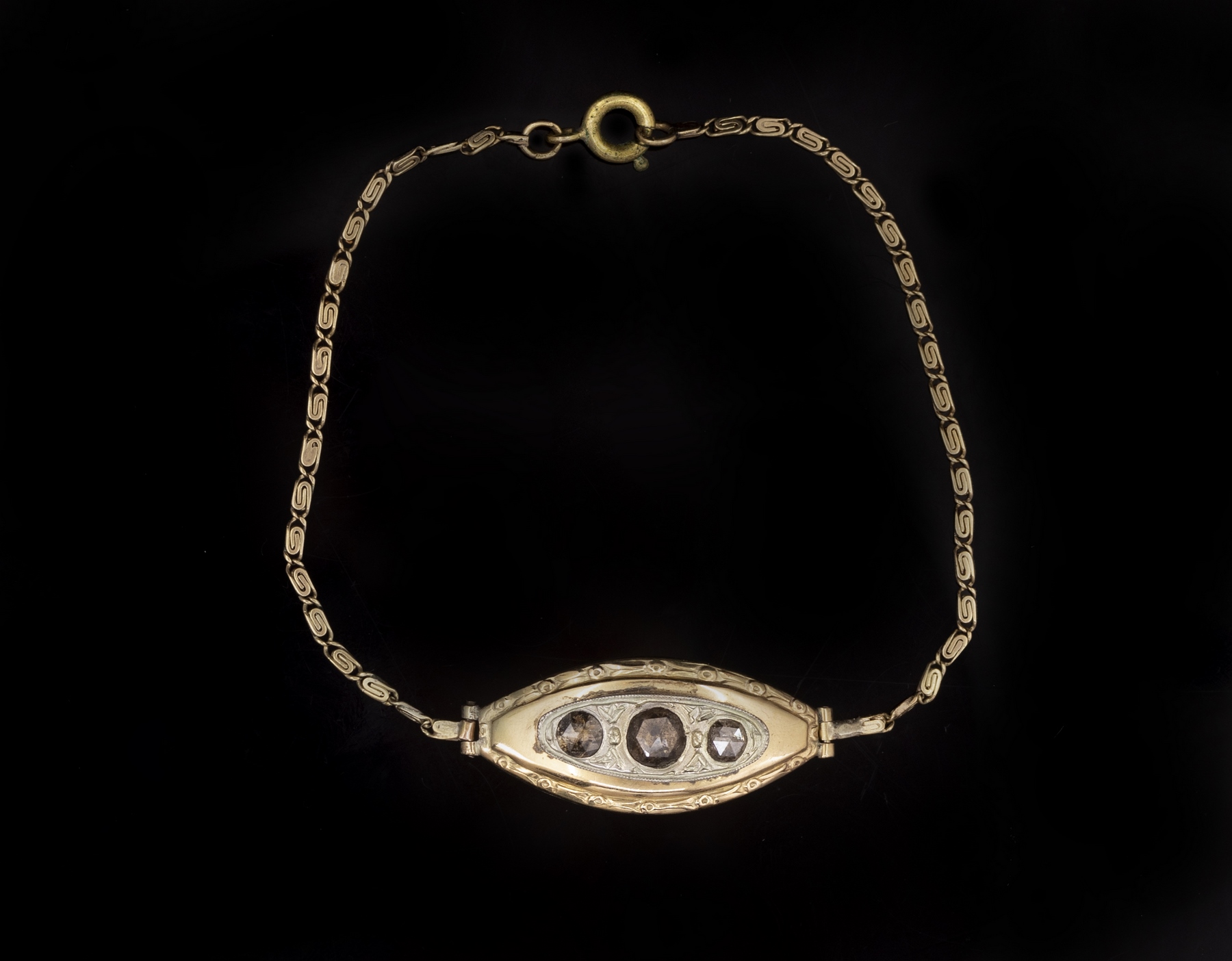 צמיד זהב 14K, מרכזו משולב כסף ומשובץ 3 דיאמנטים (4-5 מ”מ). אורך: 17 מ”מ. רוחב מקסימלי: 12 מ”מ. משקל: 3.7 גרם. לא חתום, זהב נבדק (סוגר מצופה זהב).