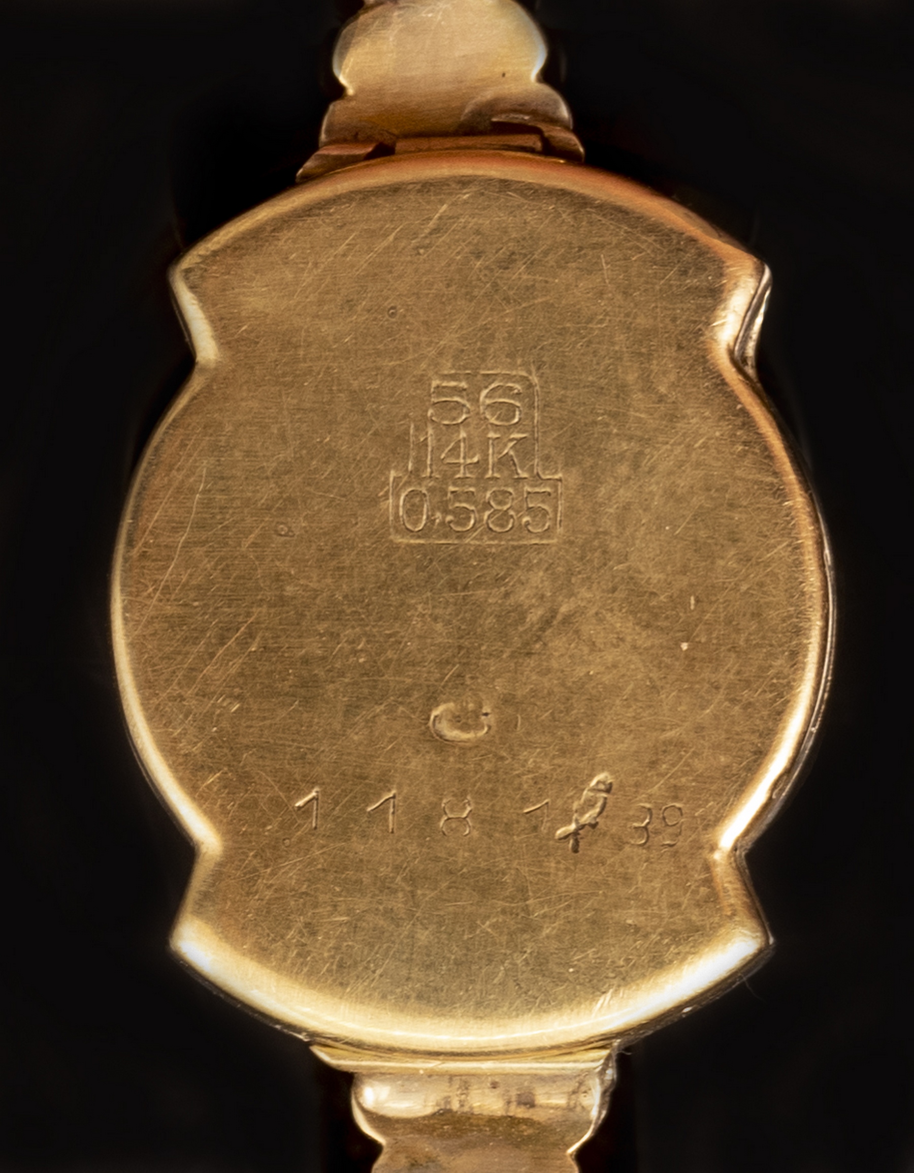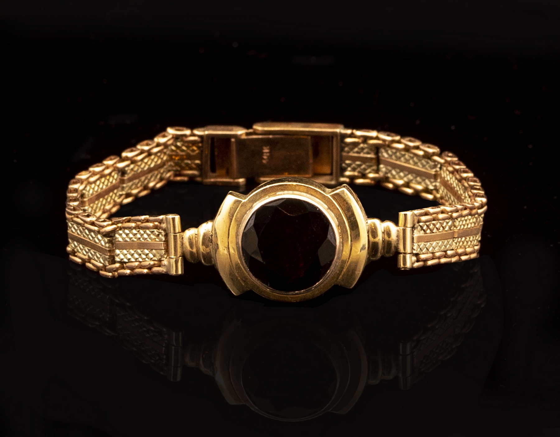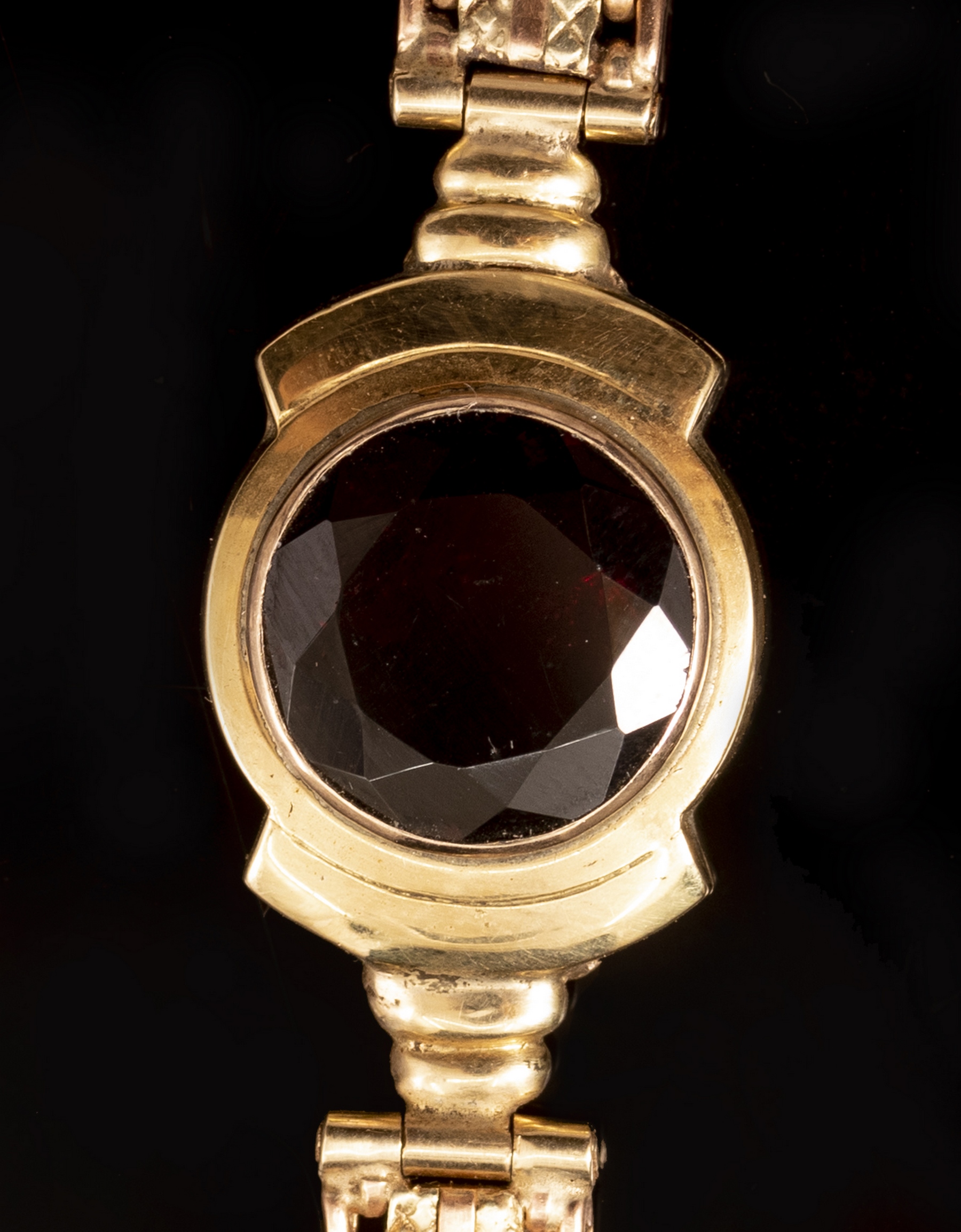 צמיד זהב 14K שהוסב משעון יד לאישה, במקום מנגנון השעון שובצה אבן חן אדומה. רצועת השעון ומסגרת השעון עשויות זהב 14K (חתומים). משקל כולל (יחד עם האבן): 19.6 גרם, אורך: 19 ס”מ, קוטר האבן: 1.4 ס”מ.
