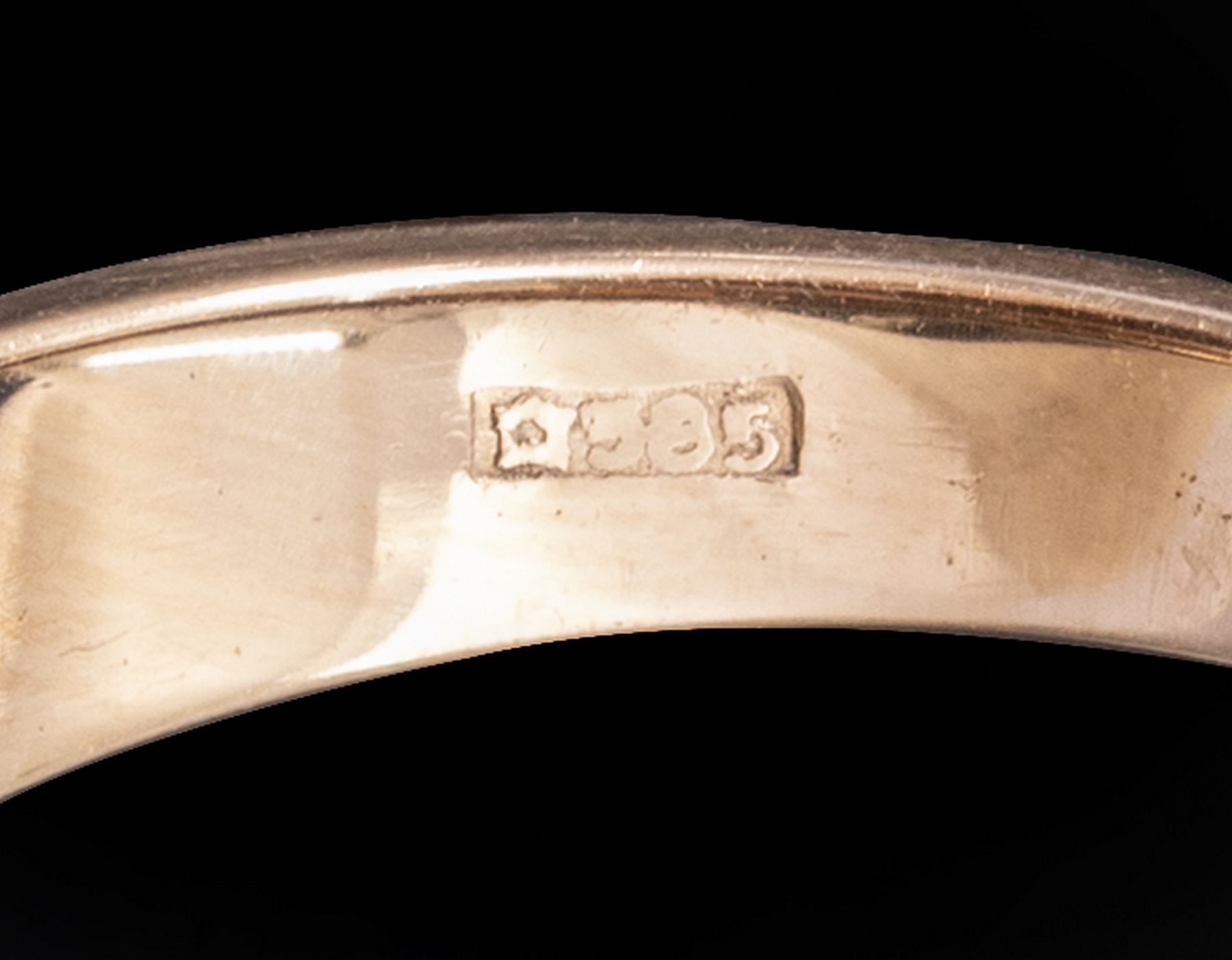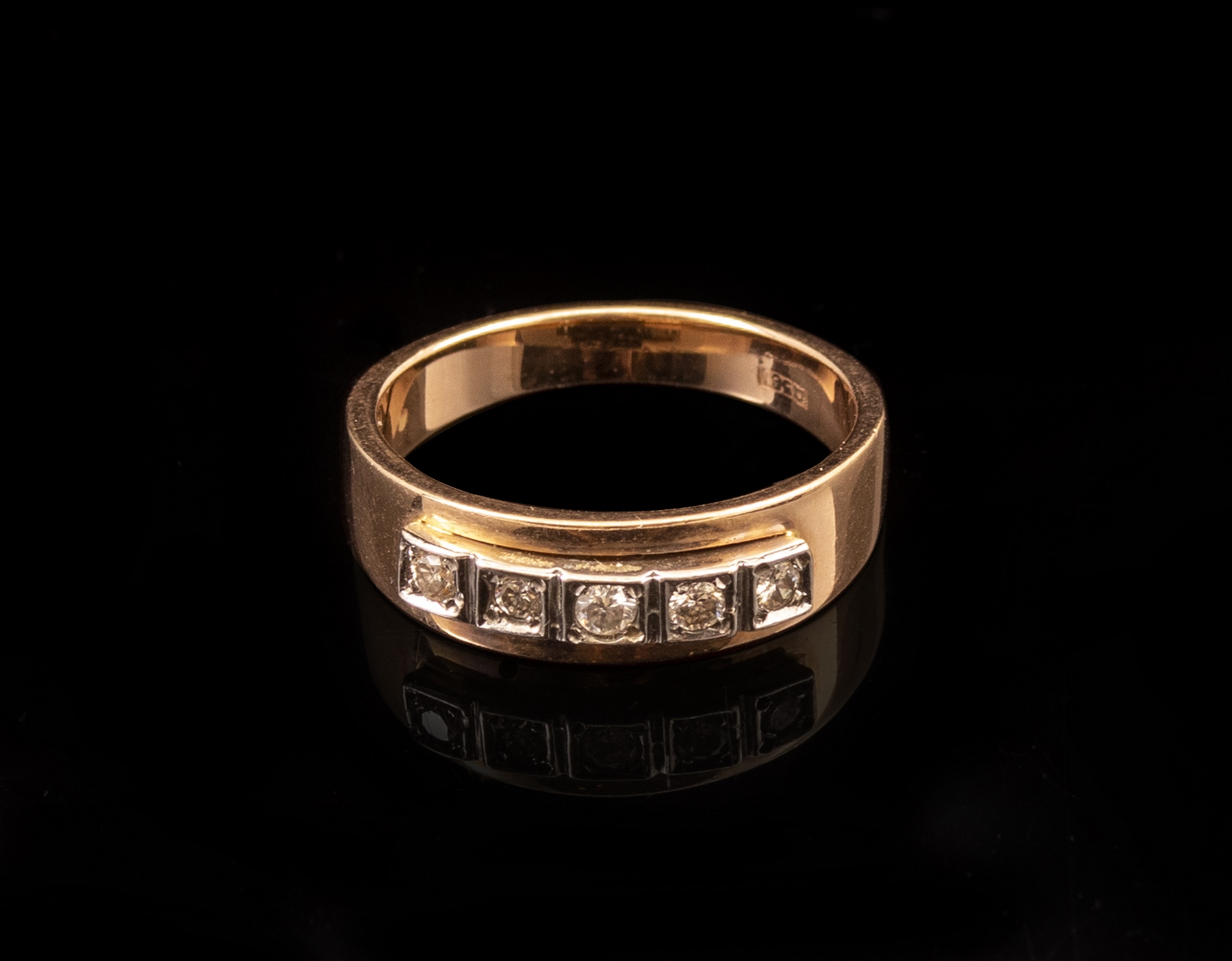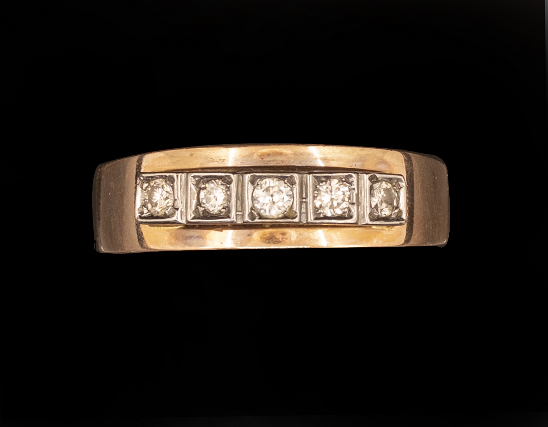 טבעת זהב 14K משובצת 5 יהלומים במשקל של כ-5 נק’ כ”א. מידה: 9 US, משקל: 5.4 גרם. חתומה.