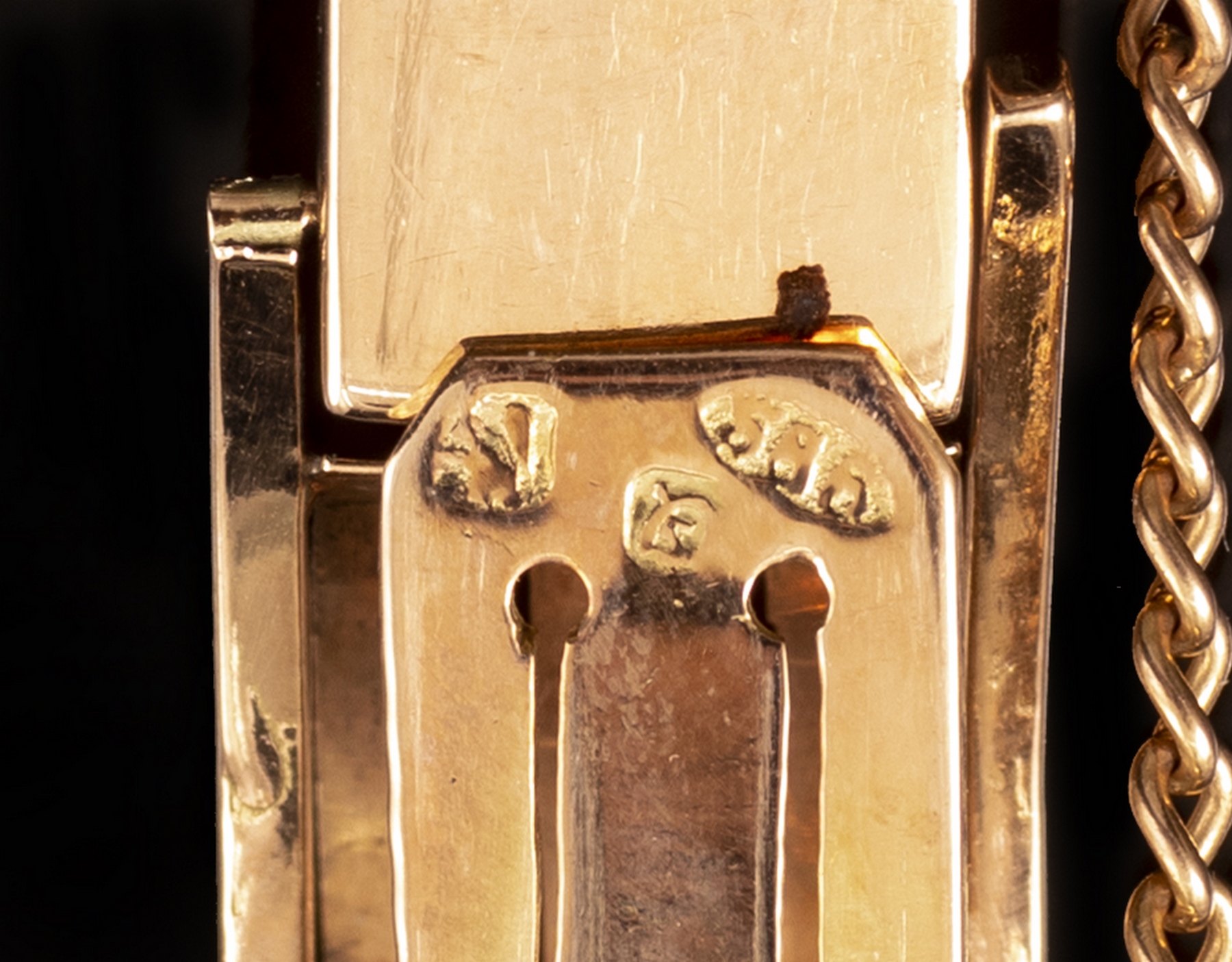 צמיד זהב 14K עשוי חוליות משולב זהב לבן ומעוטר בחריטות. אורך: 18 ס”מ. רוחב: 10 מ”מ. משקל: 22 גרם. חתום.