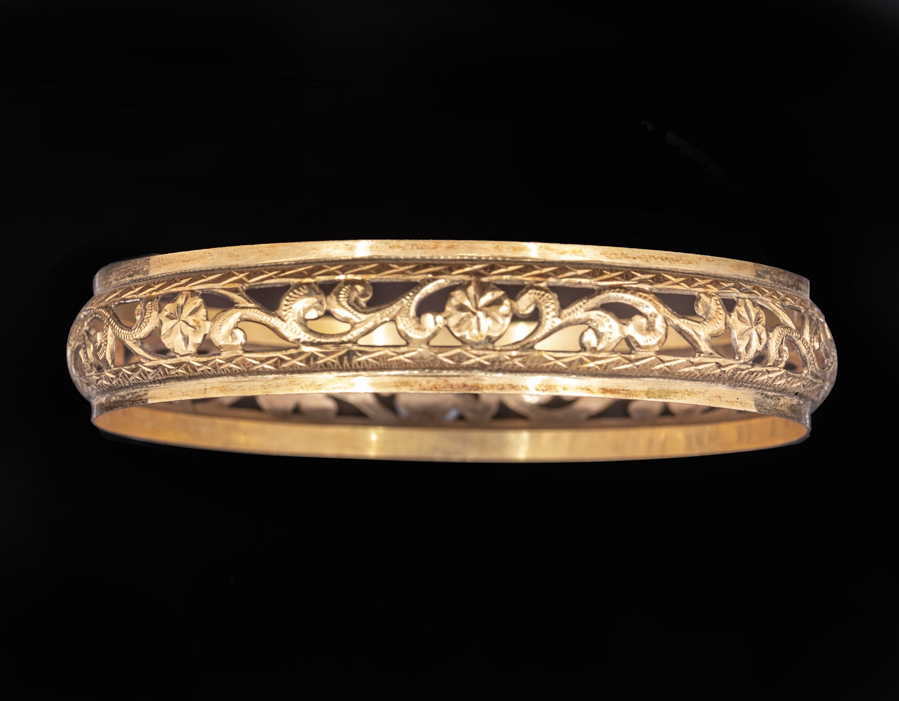 צמיד זהב 14K מעוטר עבודה פתוחה עם מוטיבים צמחיים. קוטר פנימי: 70 מ”מ, רוחב: 14 מ”מ. משקל: 18.4 גרם. חתום.