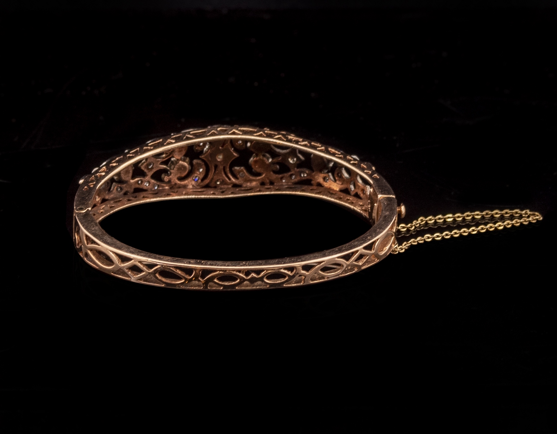 צמיד זהב 14K עתיק, משולב כסף. משובץ דיאמנטים ורובינים. מידות פנים: 56X46 מ”מ. רוחב מקסימלי: 14 מ”מ. משקל: 22.7 גרם. חתום.