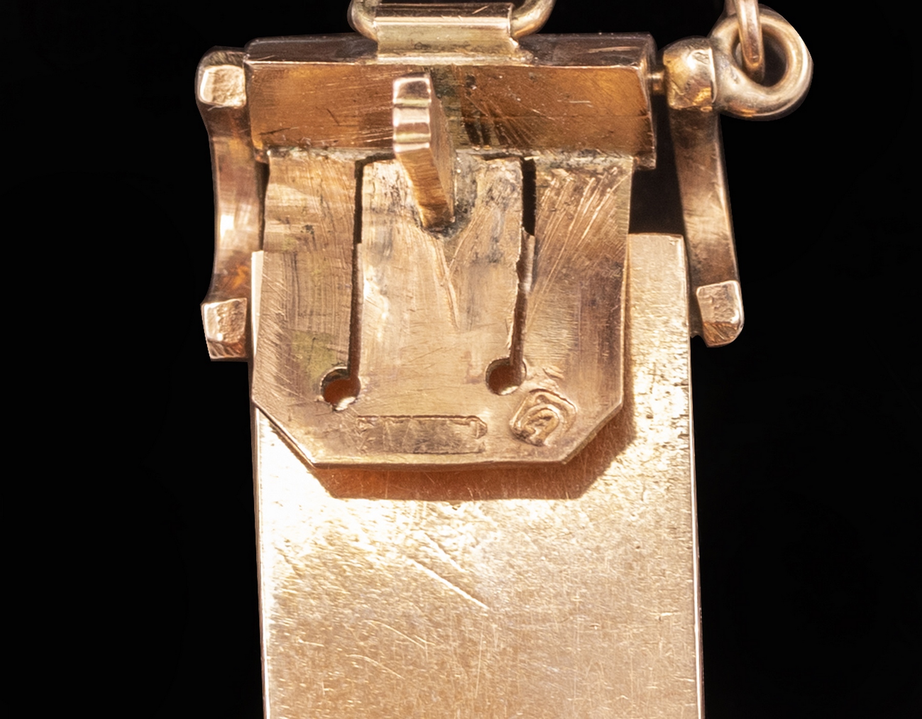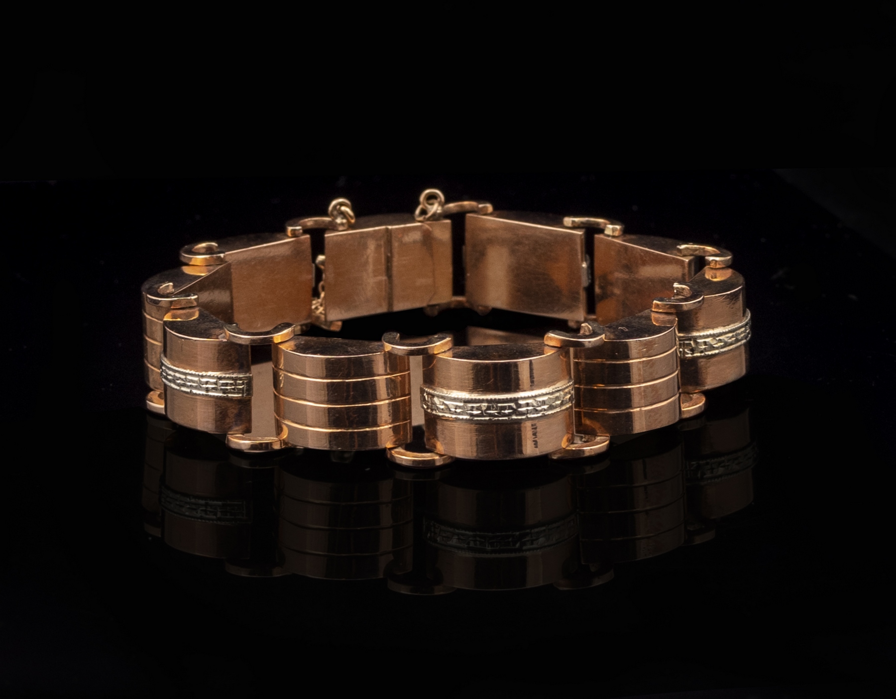 צמיד זהב 14K עשוי חוליות משולב זהב לבן. אורך: 17.5 ס”מ. רוחב: 13 מ”מ. משקל: 26.8 גרם. חתום. שרשרת ביטחון מנותקת.
