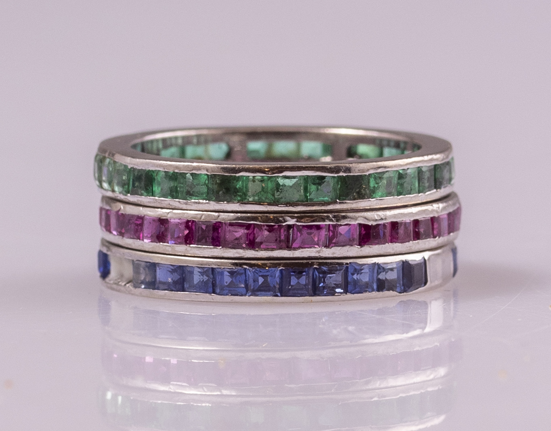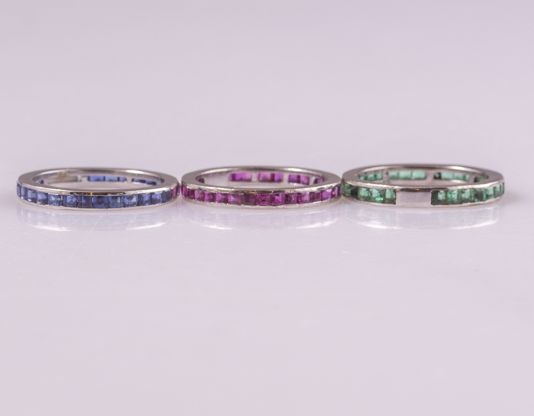 סט שלוש טבעות Eternity, זהב לבן 18K, משובצות אמרלד, רובי וספיר. ניתנות לענידה בנפרד. מידה 8 US, משקל: 10.6 גרם. לא חתומות, זהב נבדק. מספר אבנים חסרות.