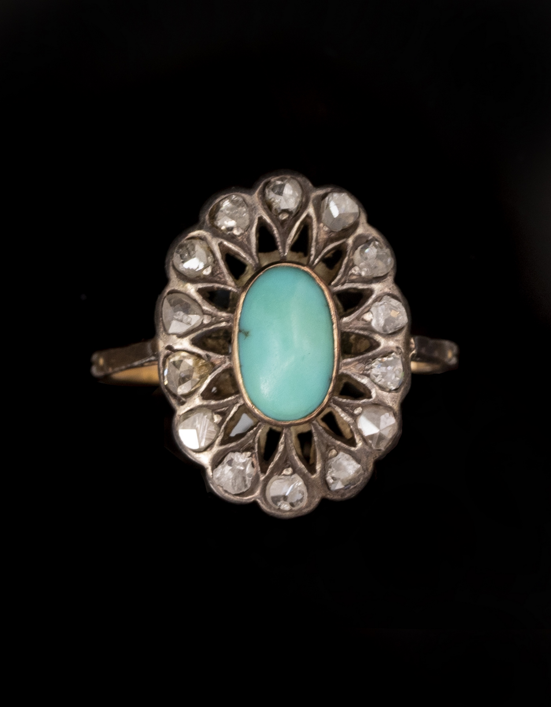 טבעת זהב 14K. משובצת טורקיז מרכזי ודיאמנטים (תושבת הדיאמנטים מכסף). מידה: 1/4 9 US, משקל: 2.8 גרם. לא חתומה, זהב נבדק. תיקון ישן.