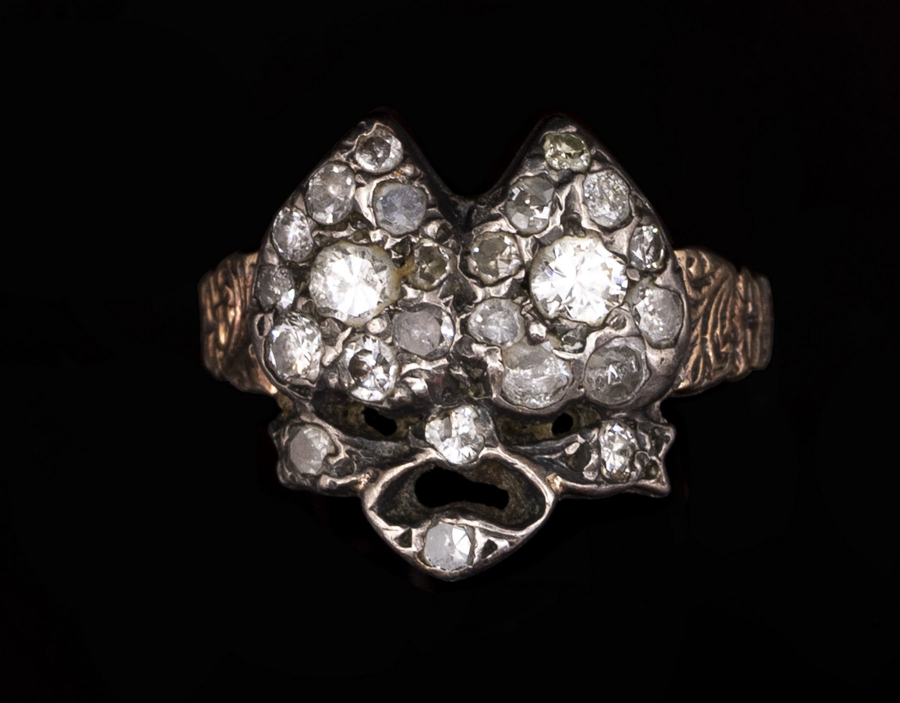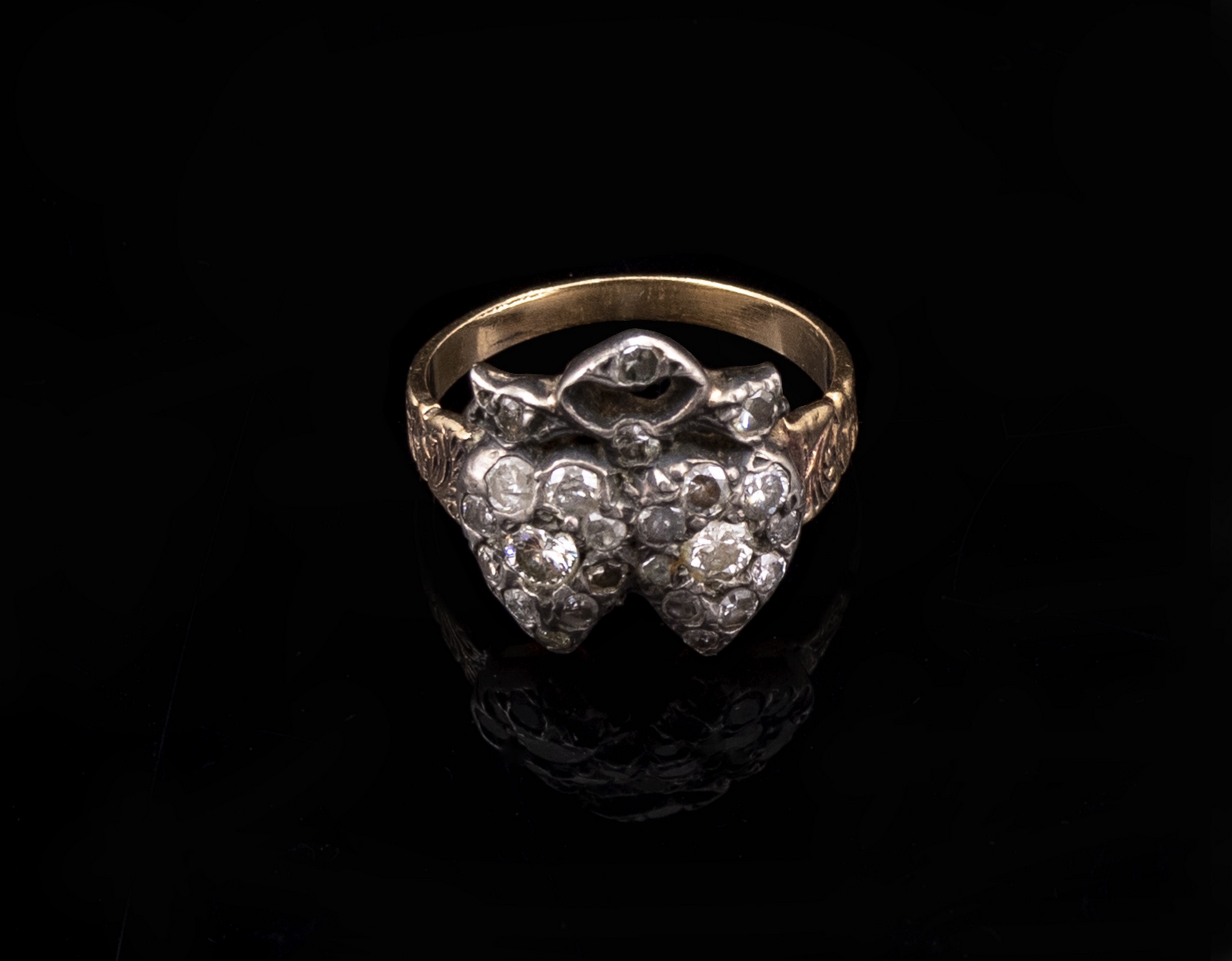 טבעת זהב 14K משולבת כסף. בצורת סרט עם לבבות. משובצת דיאמנטים. מידה: 6.5 US, משקל: 5.1 גרם. לא חתומה, הזהב נבדק.