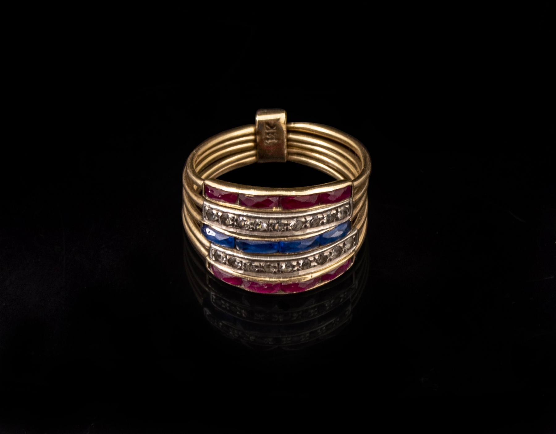 טבעת זהב 18K, מורכבת מ-5 טבעות מחוברות. משובצת ספירים, רובינים ואבנים שקופות. מידה: 3/4 7 US, משקל: 4.1 גרם. חתומה.
