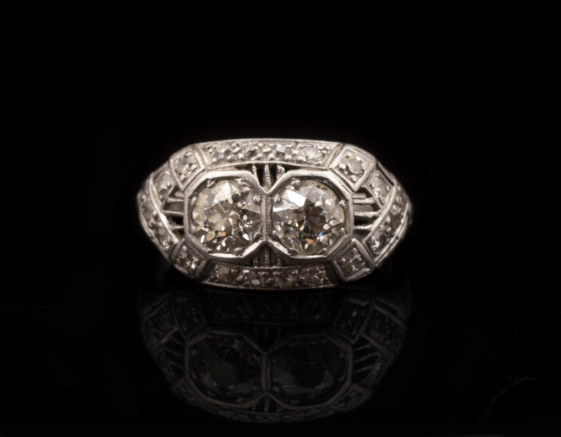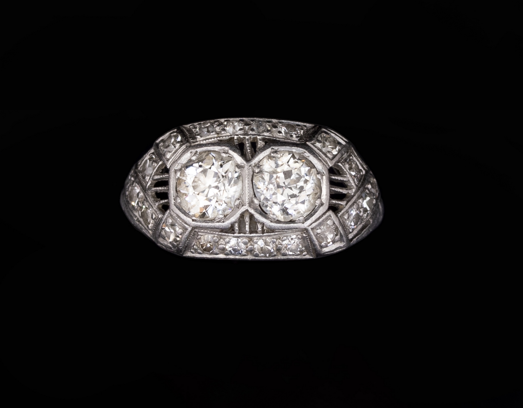טבעת פלטינה אר-דקו, משובצת 2 יהלומים בחיתוך אלט-שליף במשקל כ-חצי קראט כ”א, וכ-20 יהלומים במשקל כ-1 נק’ כ”א. סה”כ כ-1.2 קראט יהלומים. מידה: 7 US, משקל: 5.2 גרם. לא חתומה פלטינה נבדקה.