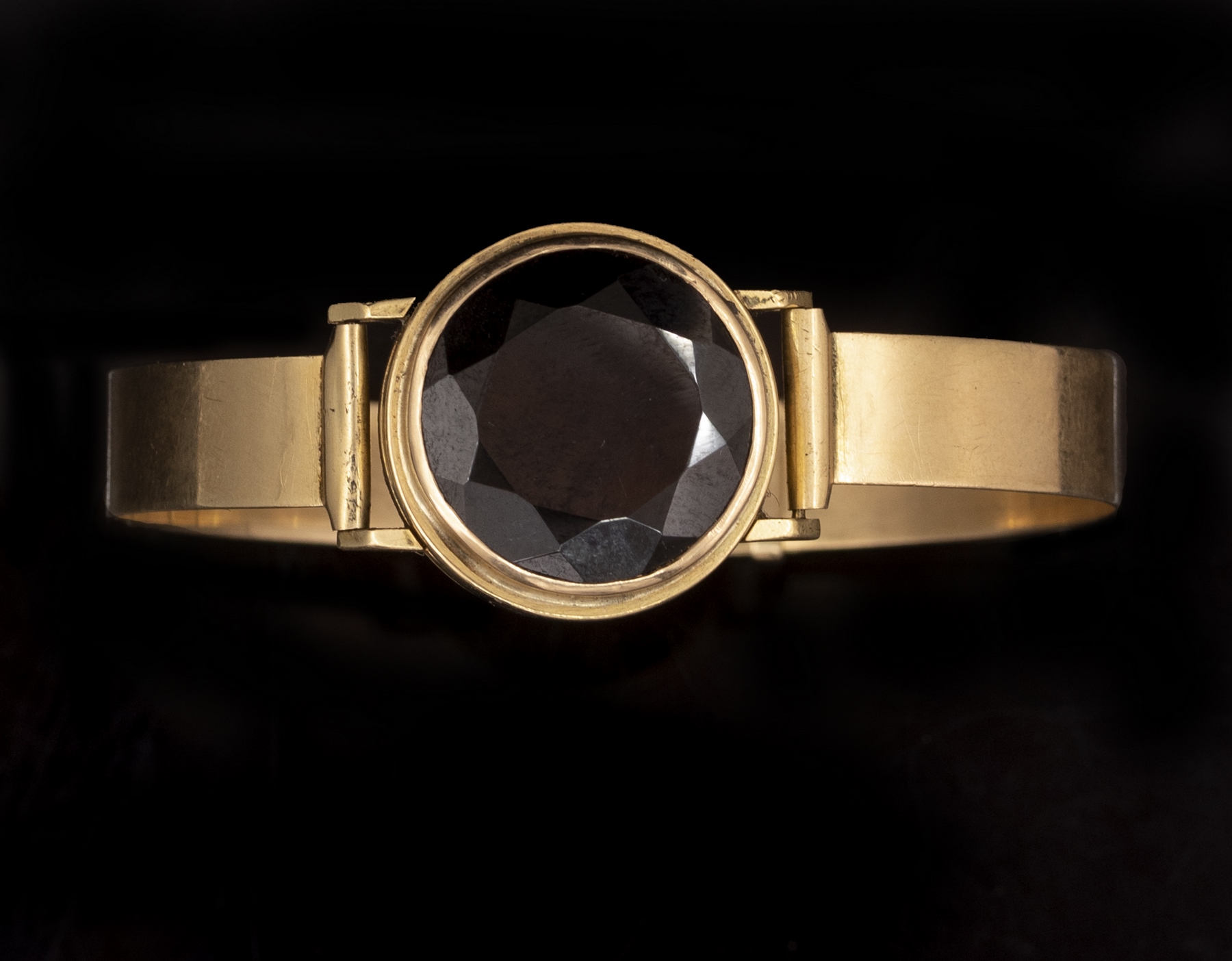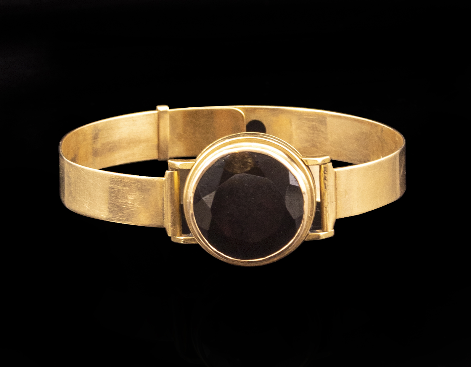 צמיד זהב 14K שהוסב משעון יד, במקום מנגנון השעון שובצה אבן חן כחולה. רצועת השעון עשויה זהב 14K (לא חתום, זהב נבדק) מסגרת השעון עשויה זהב 18K (חתום). משקל נטו (ללא האבן): 13 גרם, קוטר מקסימלי: 5.7 ס"מ, קוטר האבן: 1.9 ס"מ.