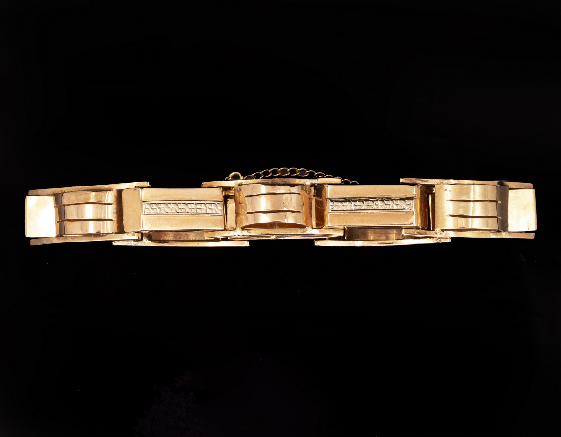 צמיד זהב 14K עשוי חוליות משולב זהב לבן ומעוטר בחריטות. אורך: 18 ס”מ. רוחב: 10 מ”מ. משקל: 22 גרם. חתום.