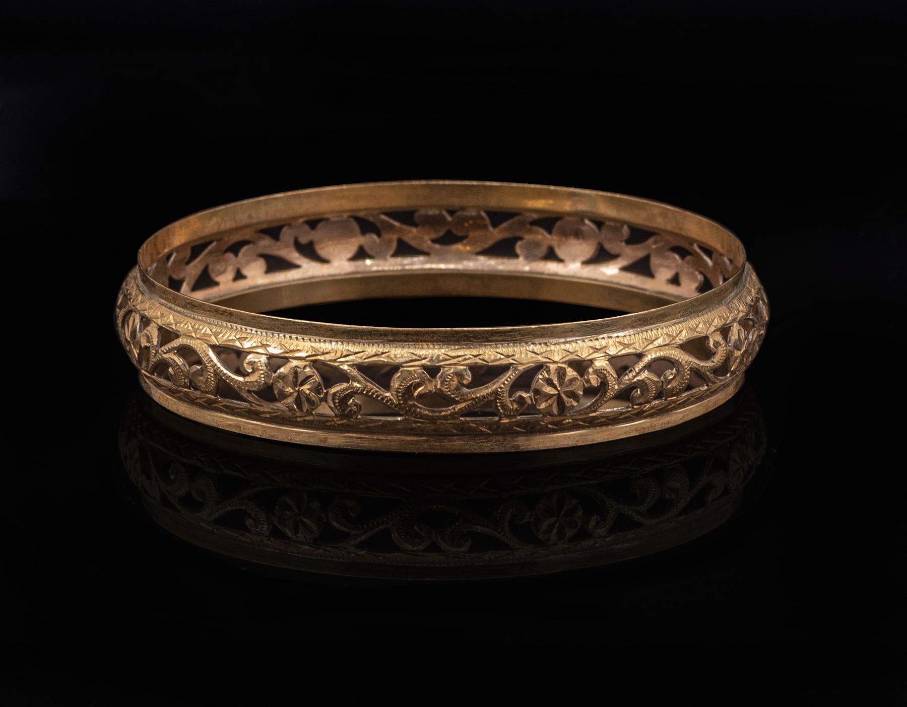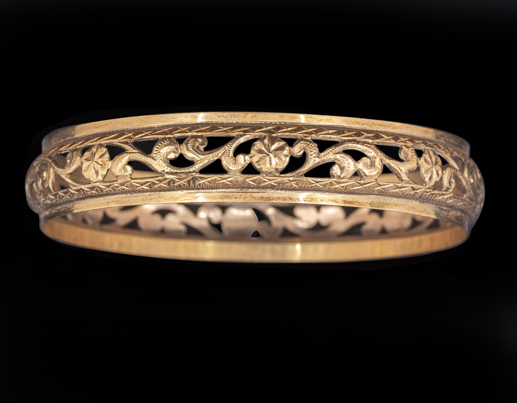 צמיד זהב 14K מעוטר עבודה פתוחה עם מוטיבים צמחיים. קוטר פנימי: 70 מ”מ, רוחב: 14 מ”מ. משקל: 18.4 גרם. חתום.