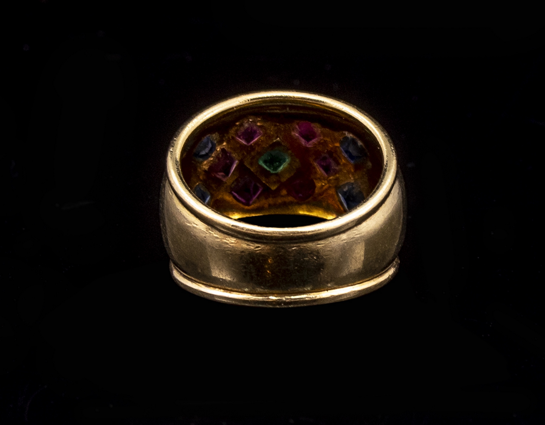 טבעת זהב 18K. משובצת אמרלד, רובינים וספירים. מידה: 6 US, משקל: 8.3 גרם. לא חתומה, זהב נבדק.
