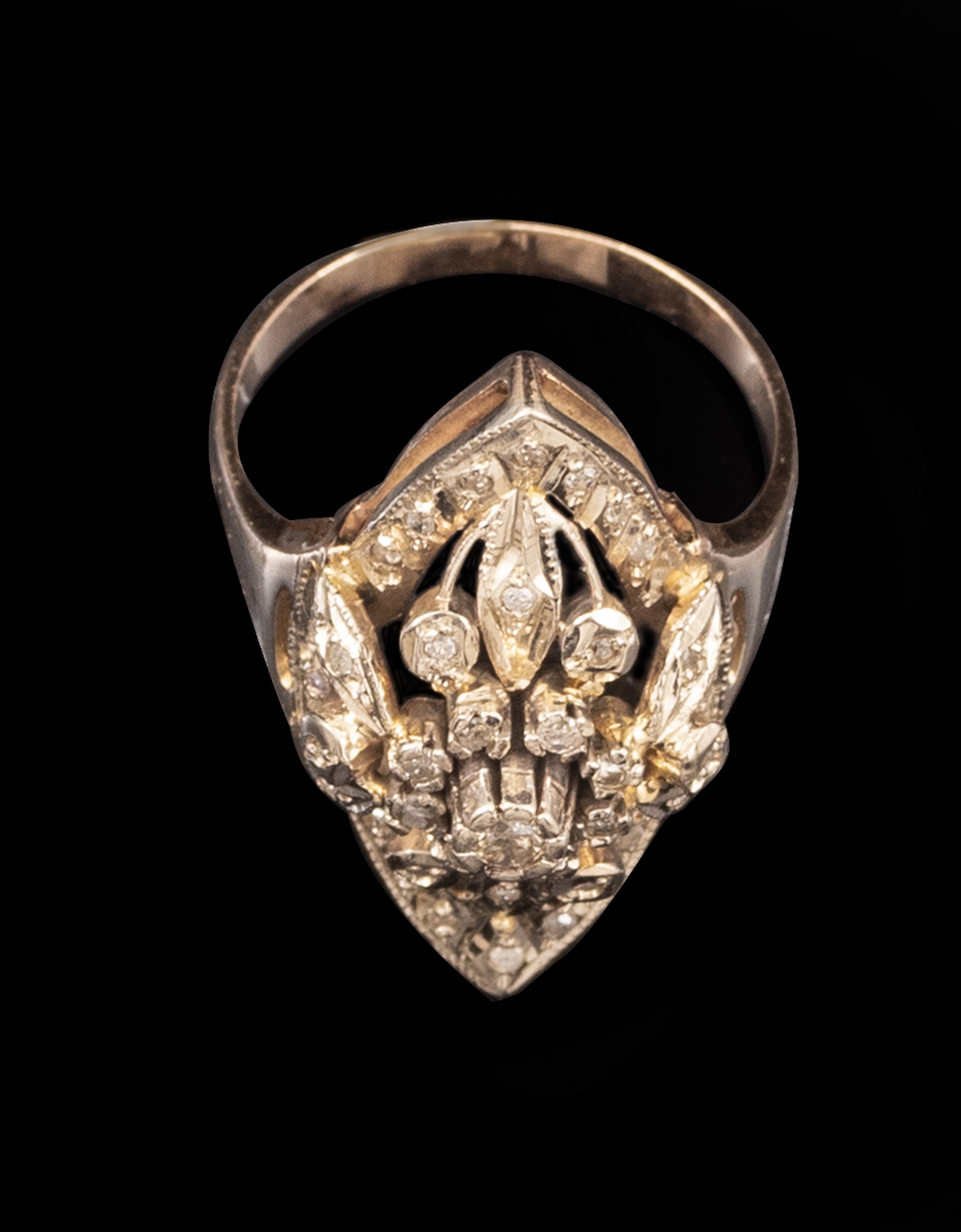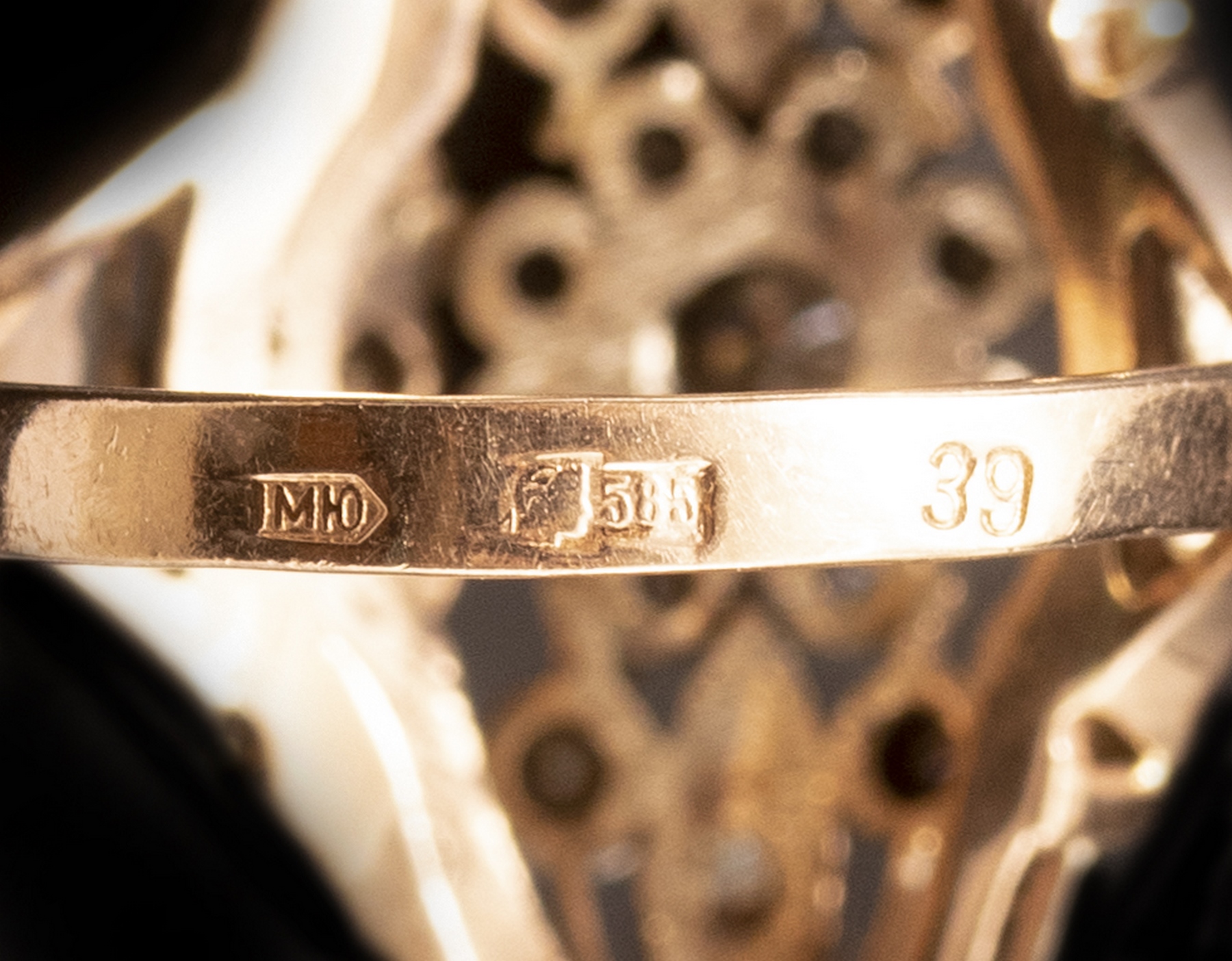 טבעת זהב 14K רוסית, משובצת יהלום במשקל כ-2.5 נק, וכ-8 יהלומים כ-2 נק’ כ”א, כ-19 נק’ סה”כ, ובנוסף דיאמנטים זעירים. מידה: 8 US, משקל: 6.3 גרם. חתומה.