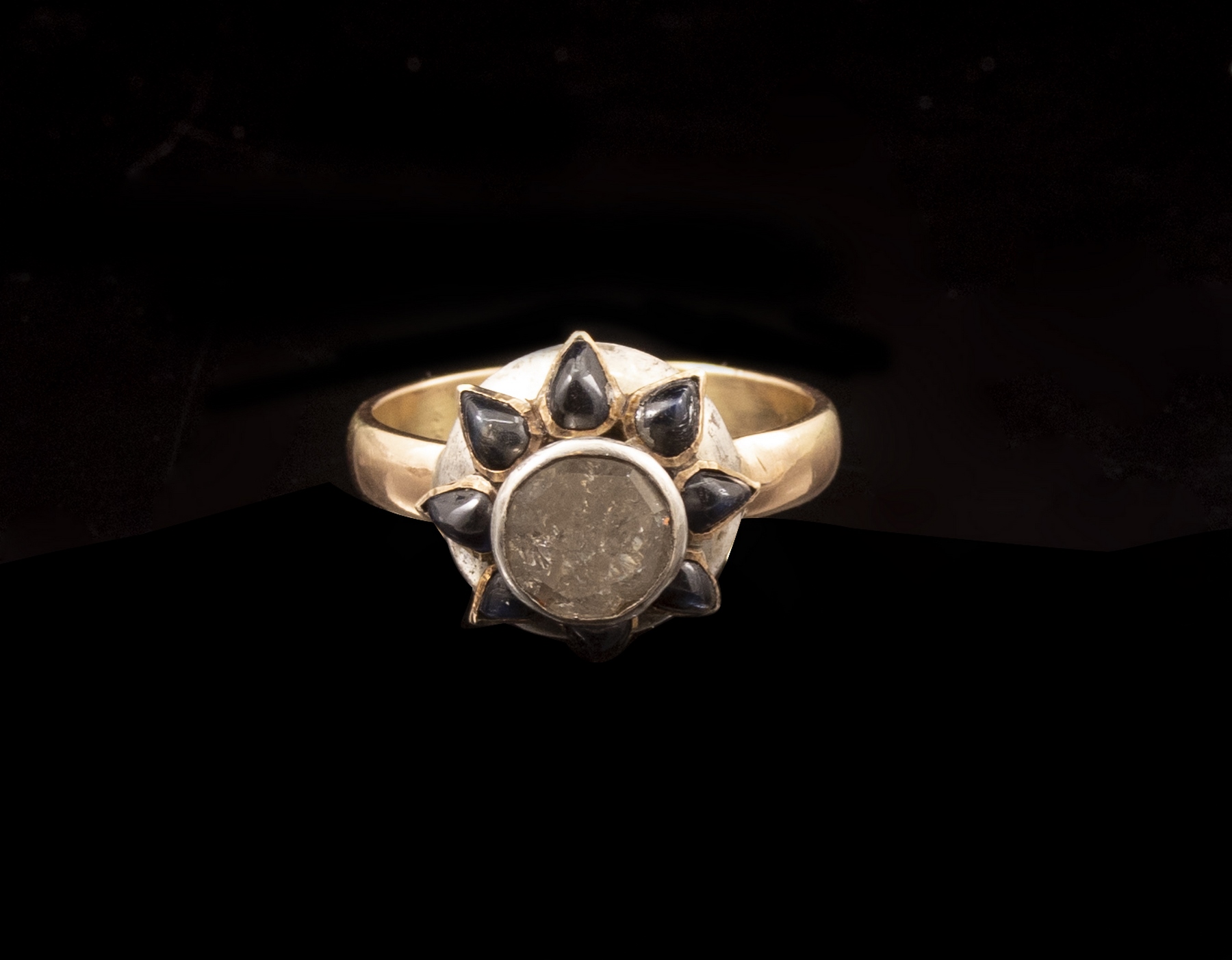 טבעת זהב 14K משולבת כסף, משובצת דיאמנט מרכזי בקוטר 7 מ”מ וסביבו 8 ספירים בצורת טיפה באורך 5 מ”מ כל אחד. מידה: 8.5 US, משקל: 6.3 גרם. חותמת שחוקה, הזהב נבדק.