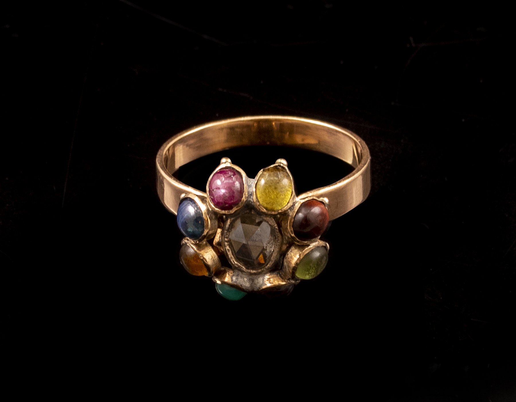 טבעת זהב 14K סובייטית בצורת פרח, משובצת דיאמנט מרכזי (6X4 מ”מ) וסביבו 8 אבני חן שונות. מידה: 3/4 8 US, משקל: 4.7 גרם. חתומה.