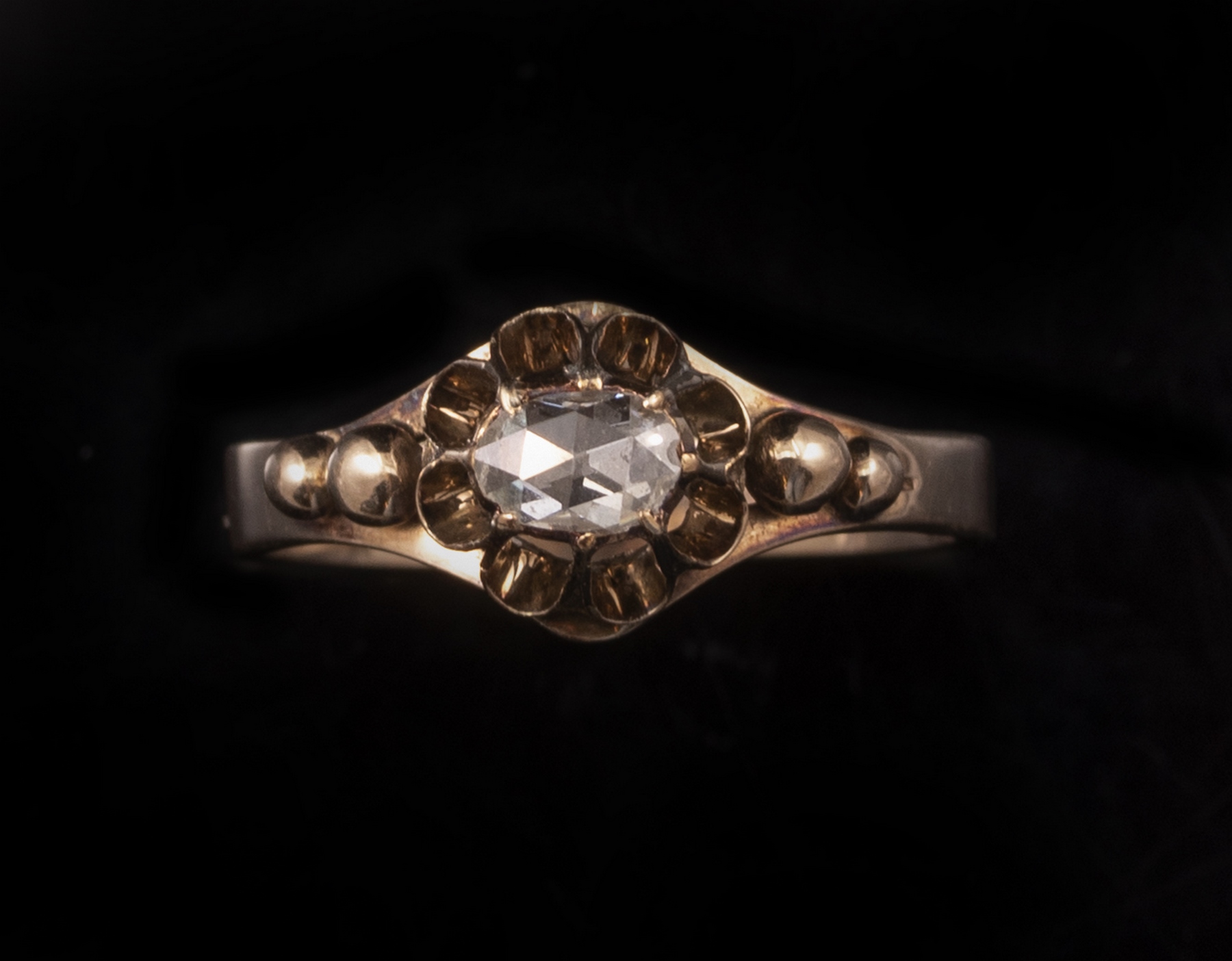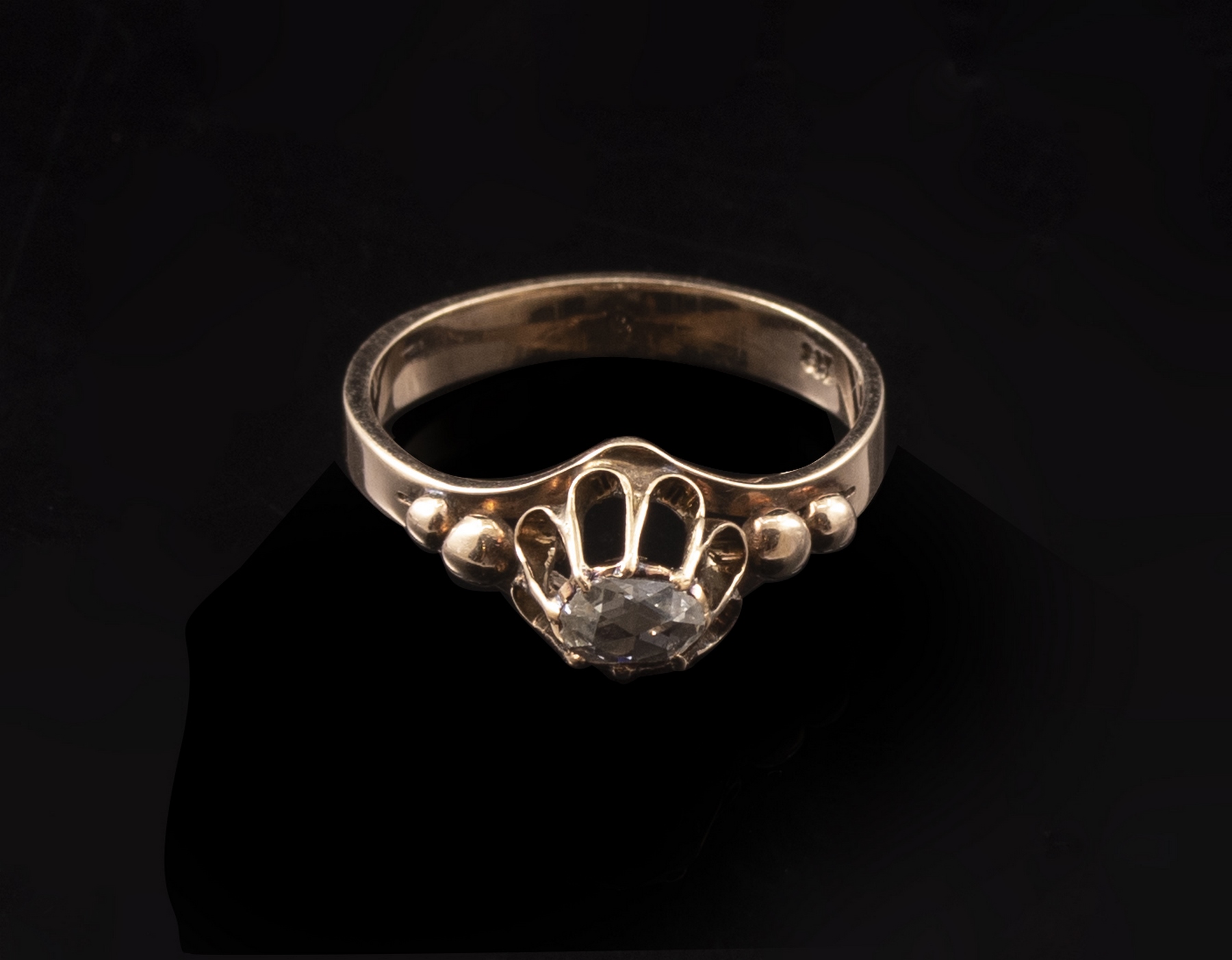 טבעת זהב 14K משובצת דיאמנט מרכזי (3 מ"מ). מידה: 1/4 7 US, משקל: 2.9 גרם. חתומה.