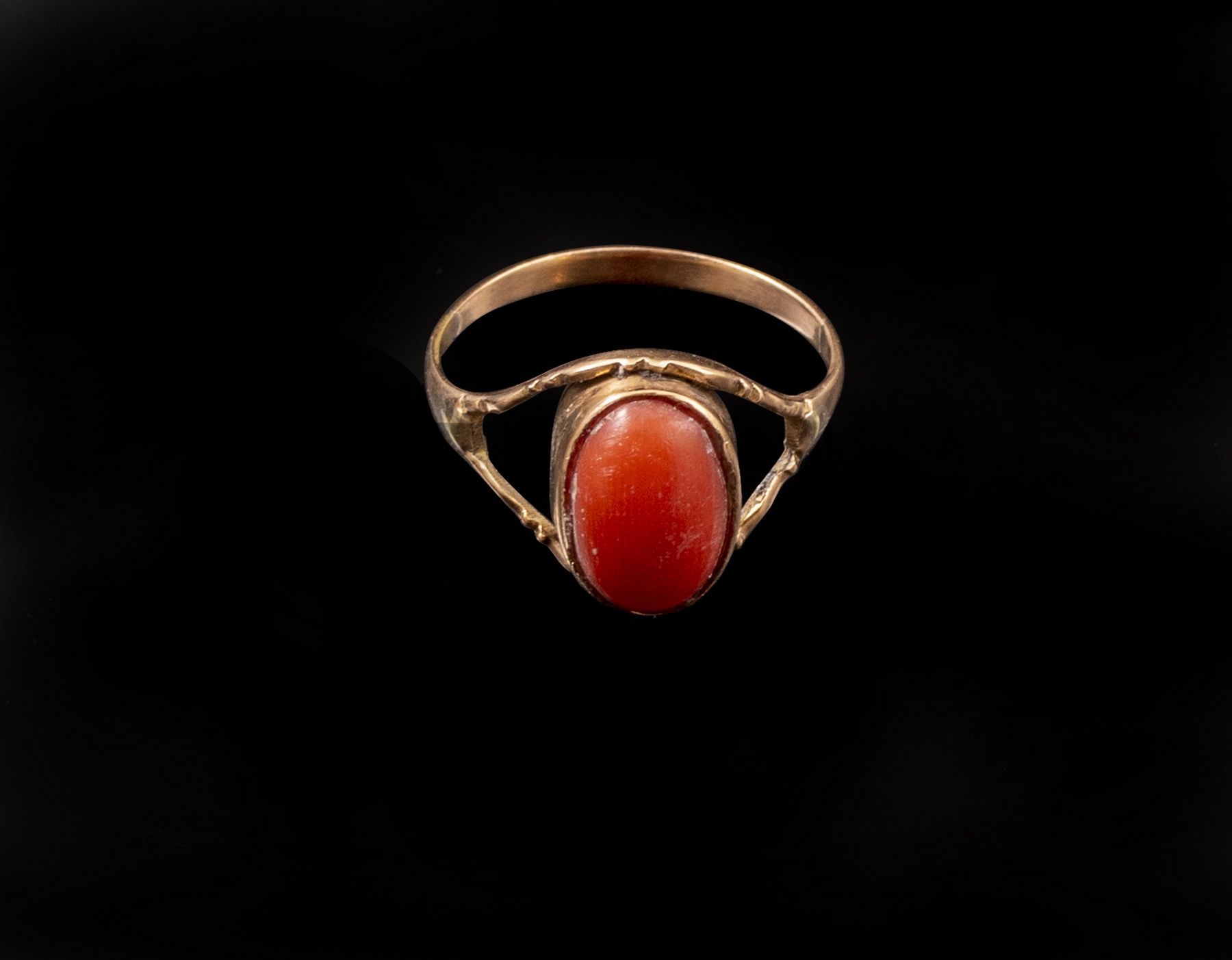 טבעת זהב 14K משובצת קורל (11X8 מ”מ). מידה: 8 US, משקל: 2.4 גרם. לא חתומה, הזהב נבדק.