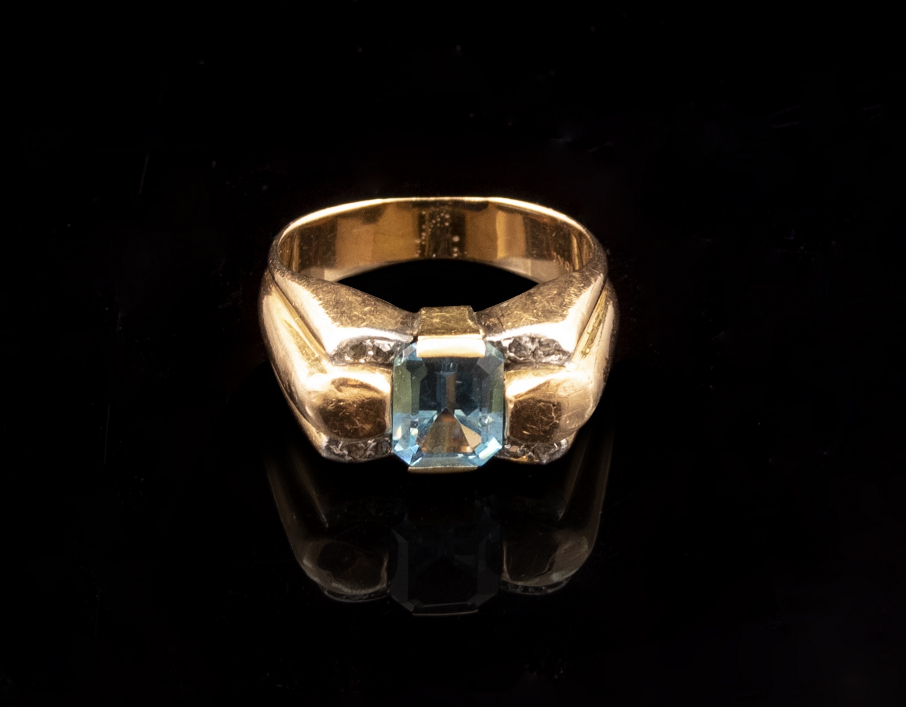 טבעת זהב 18K, משובצת בלו טופז מרכזית (9X7 מ”מ) ומסביב דיאמנטים. מידה: 9.5 US, משקל: 8.4 גרם. חתומה. סדק זעיר לזהב.