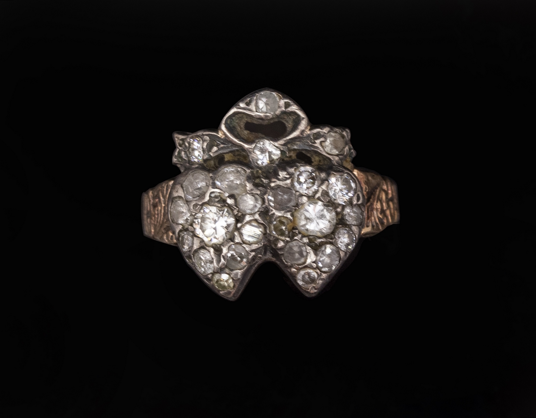טבעת זהב 14K משולבת כסף. בצורת סרט עם לבבות. משובצת דיאמנטים. מידה: 6.5 US, משקל: 5.1 גרם. לא חתומה, הזהב נבדק.