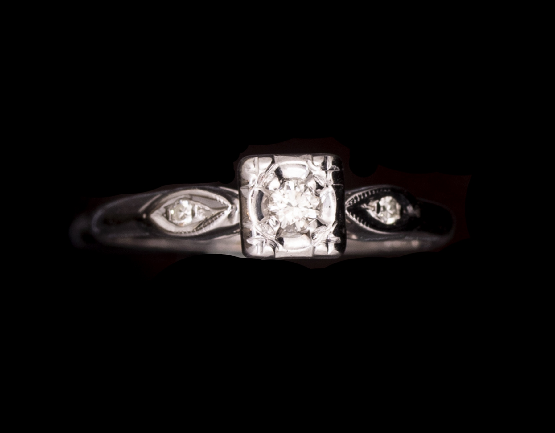 טבעת זהב לבן 14K, משובצת יהלום בחיתוך אלט שליף במשקל כ-8 נק’ ושני יהלומים במשקל כ-2 כ”א, כ-12 נק’ סה”כ. מידה: 3/4 4 US, משקל: 1.6 גרם. חתומה.