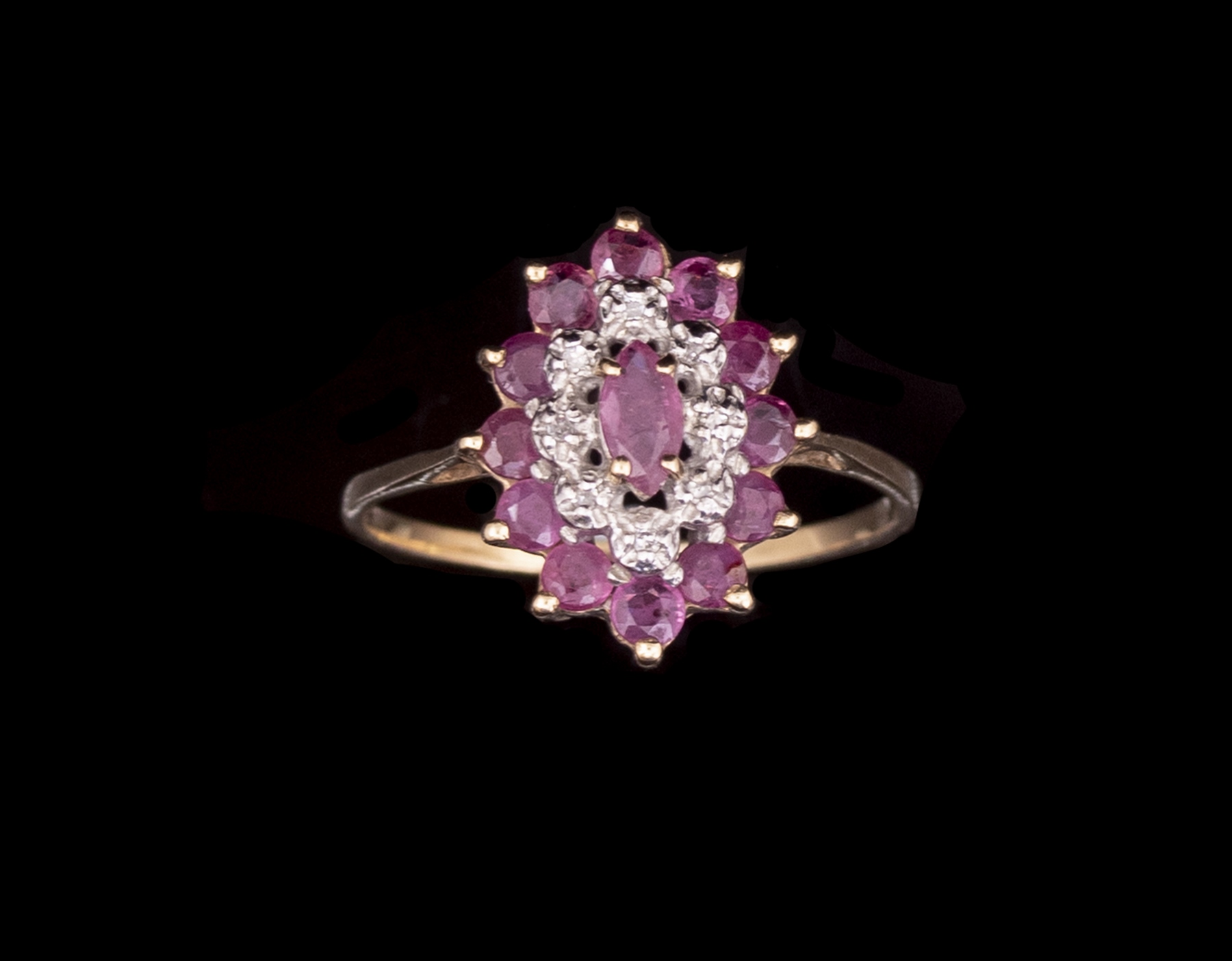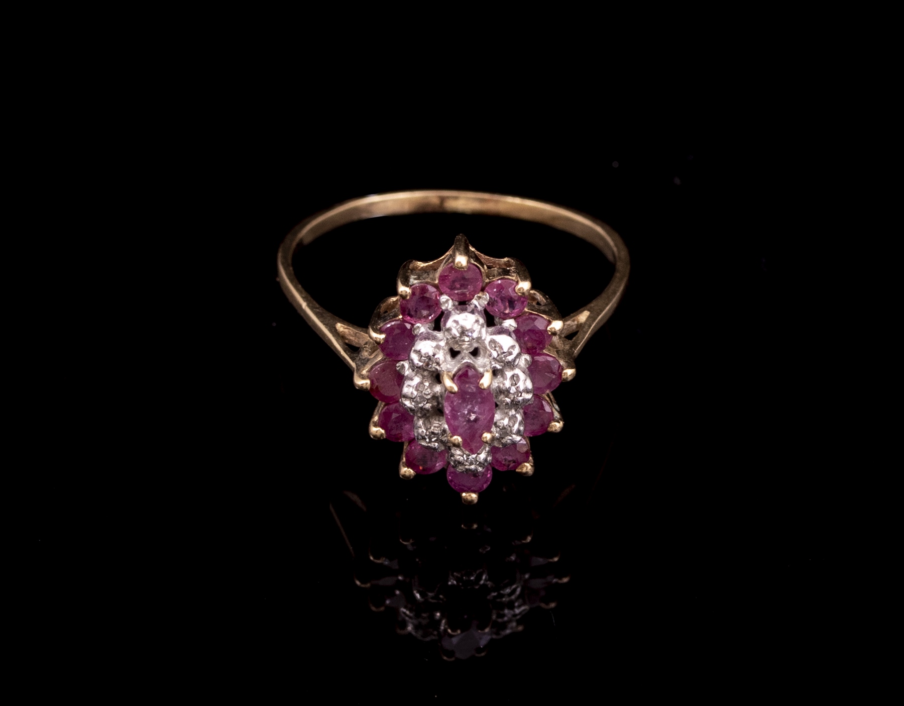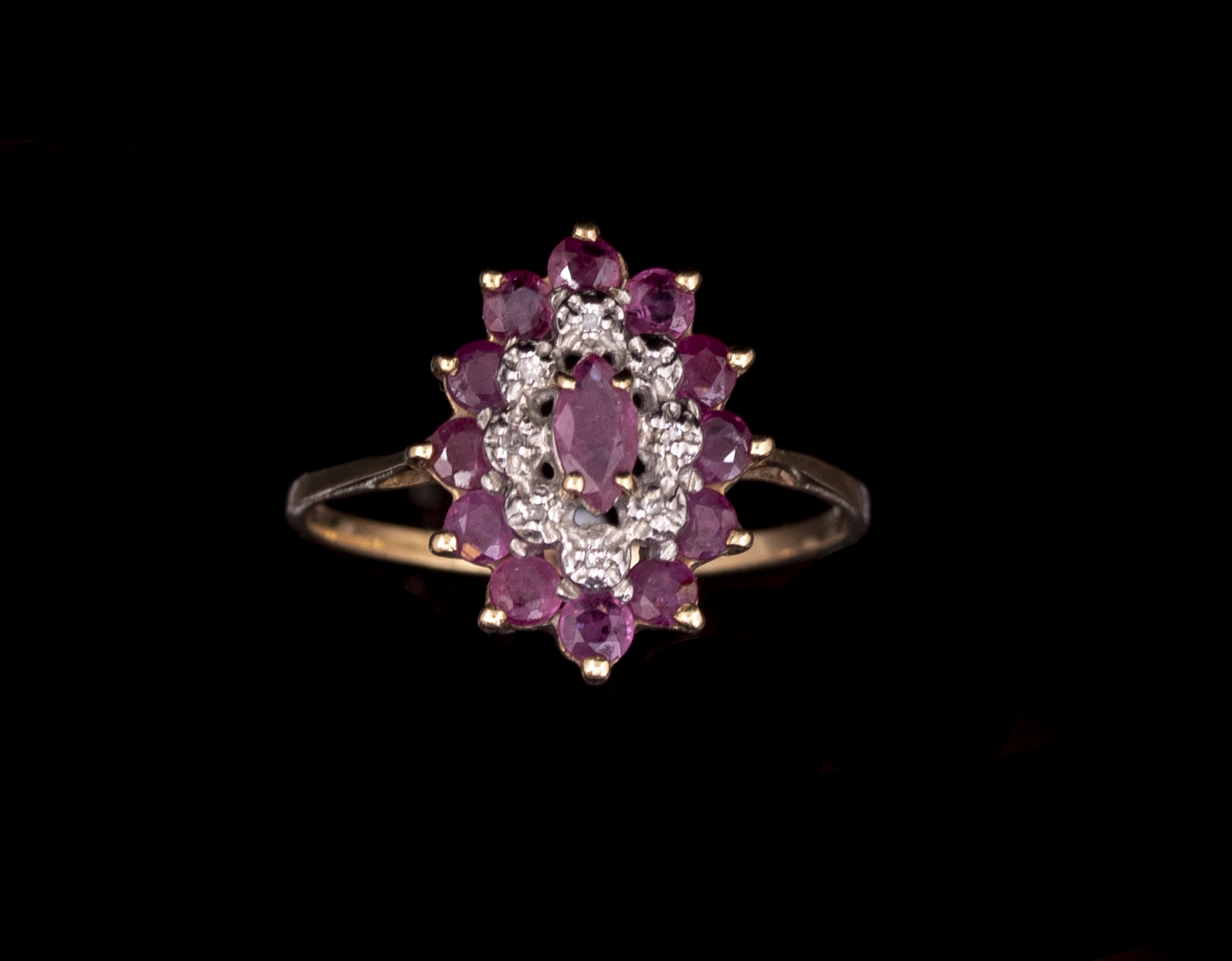 טבעת זהב 9K משובצת אבני רובי ודיאמנטים. מידה: 7 US, משקל: 1.9 גרם. חתומה.