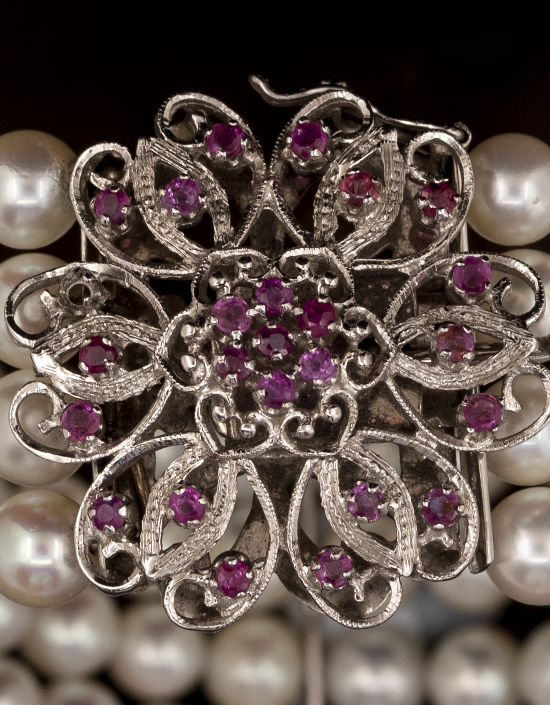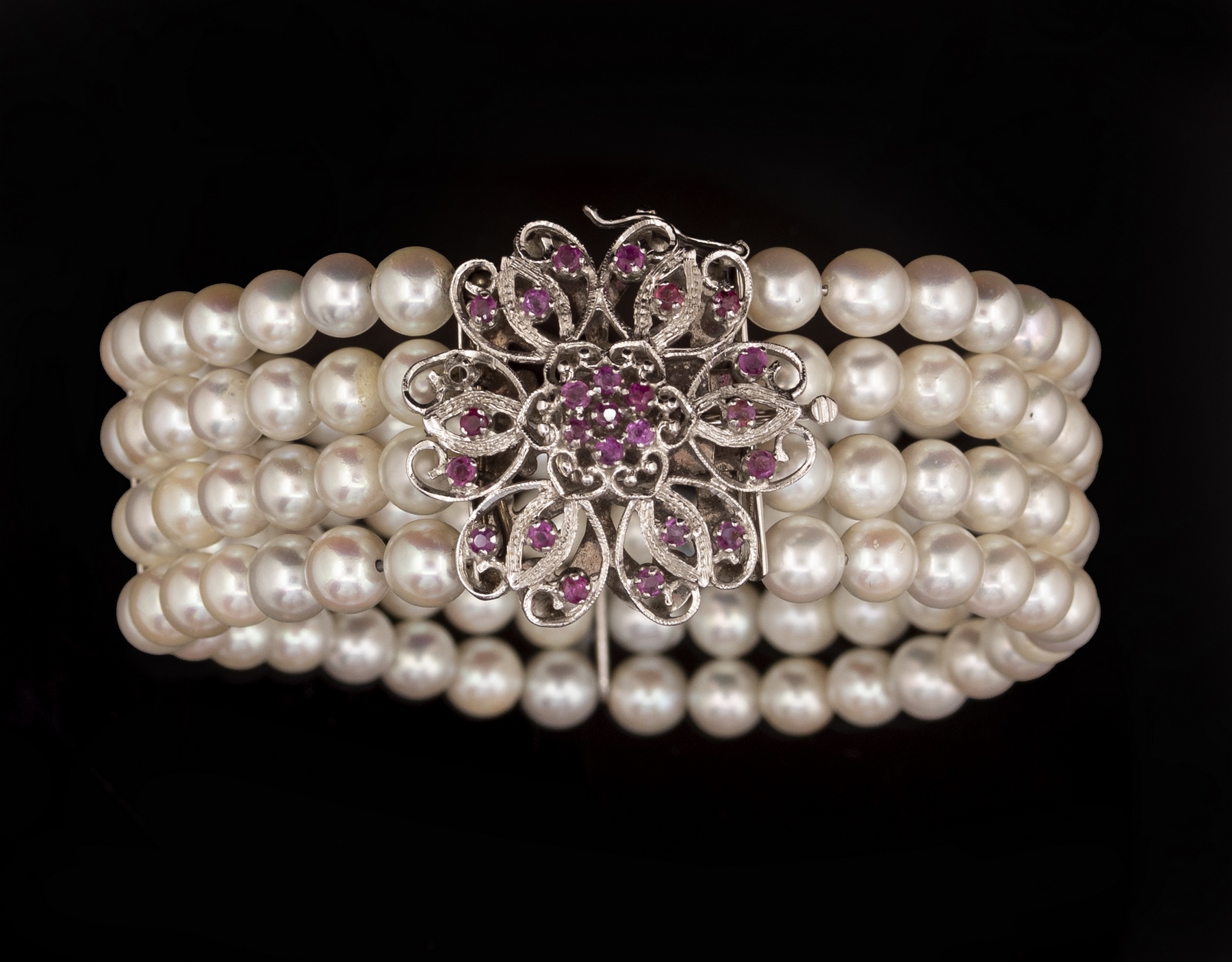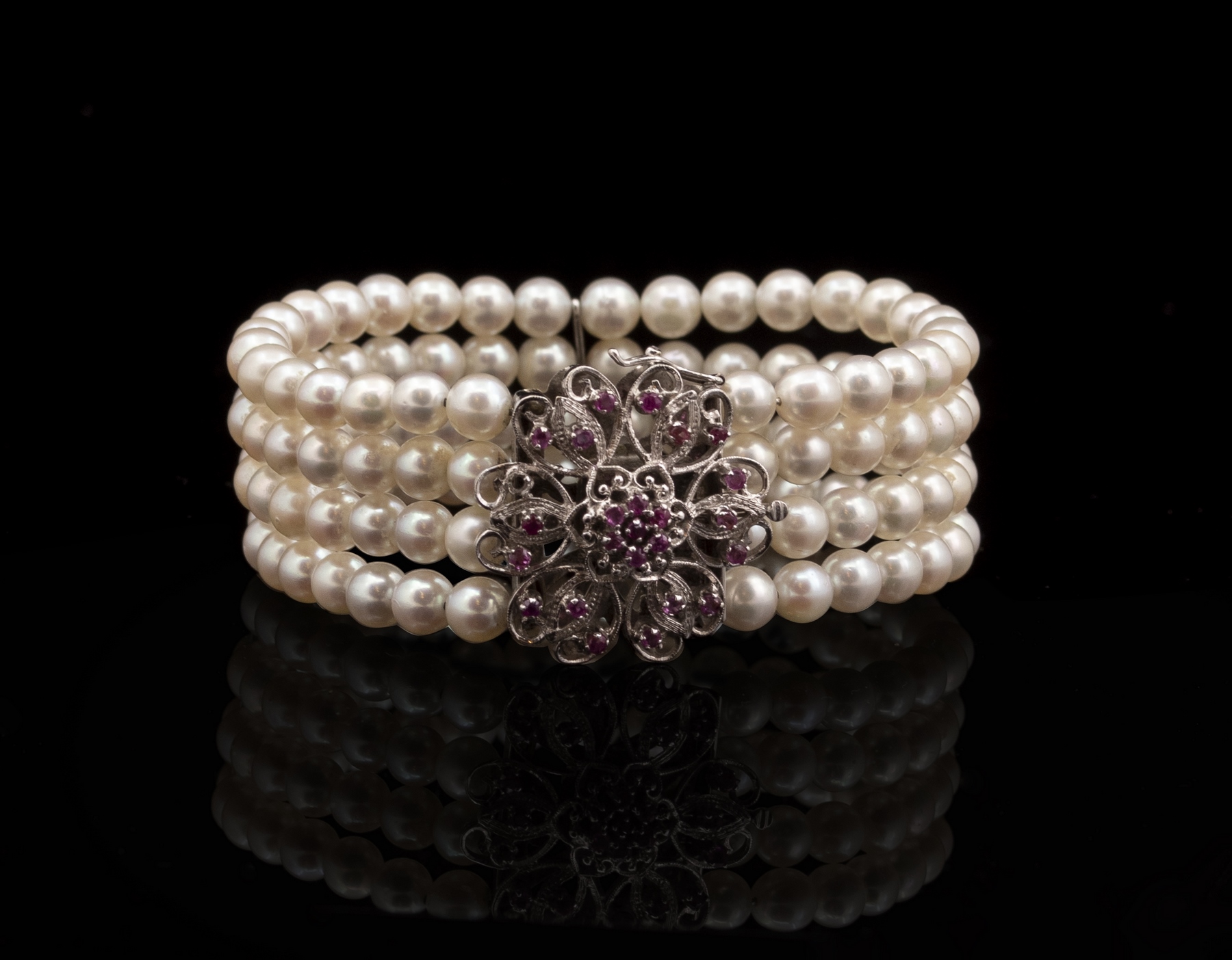צמיד פנינים 4 שורות עם סוגר מזהב לבן 18K משובץ כ-24 רובינים זעירים. קוטר פנימי: 60 מ”מ. רוחב: 22 מ”מ. קוטר הפנינים: 6 מ”מ. משקל כולל: 45 גרם. חתום.