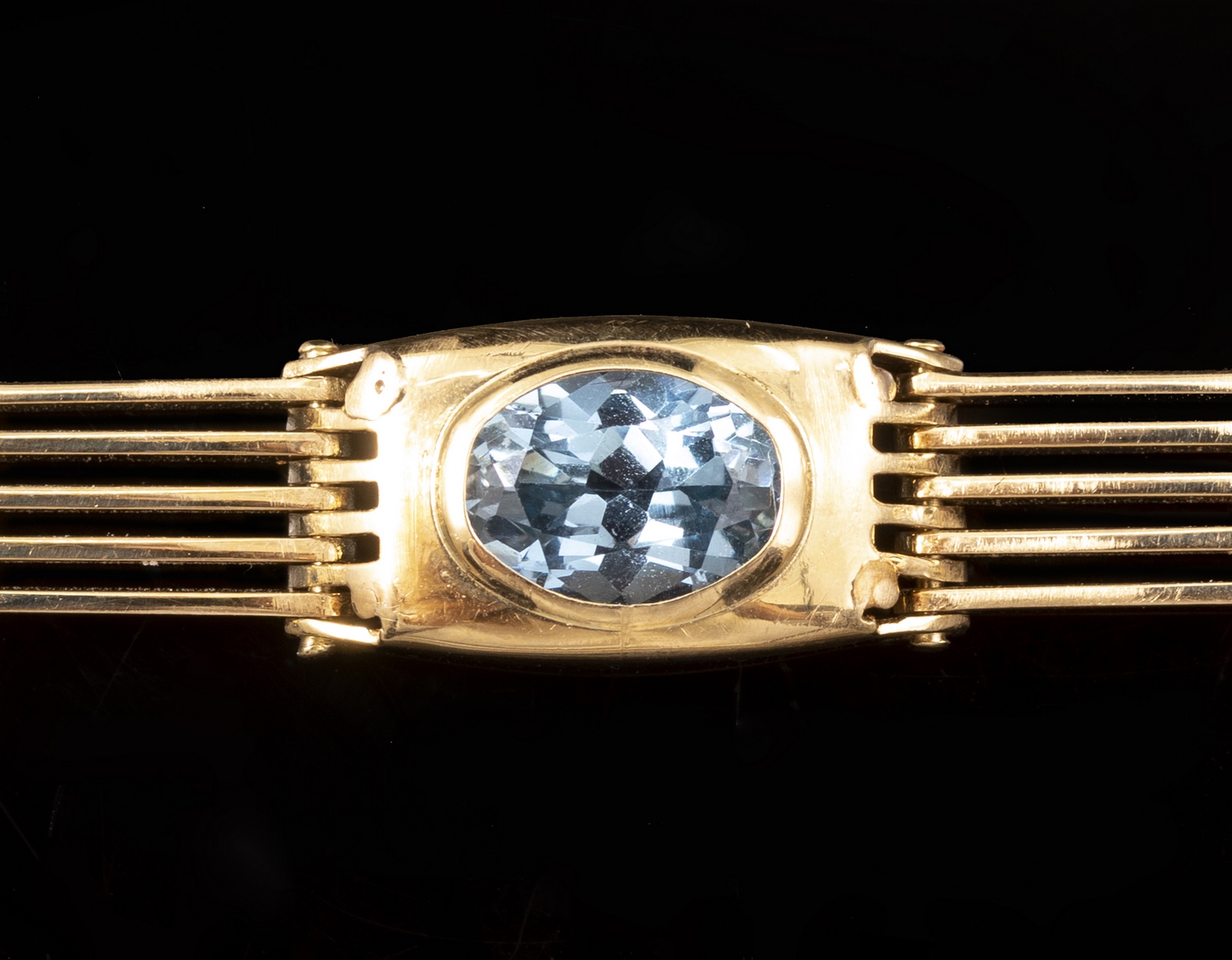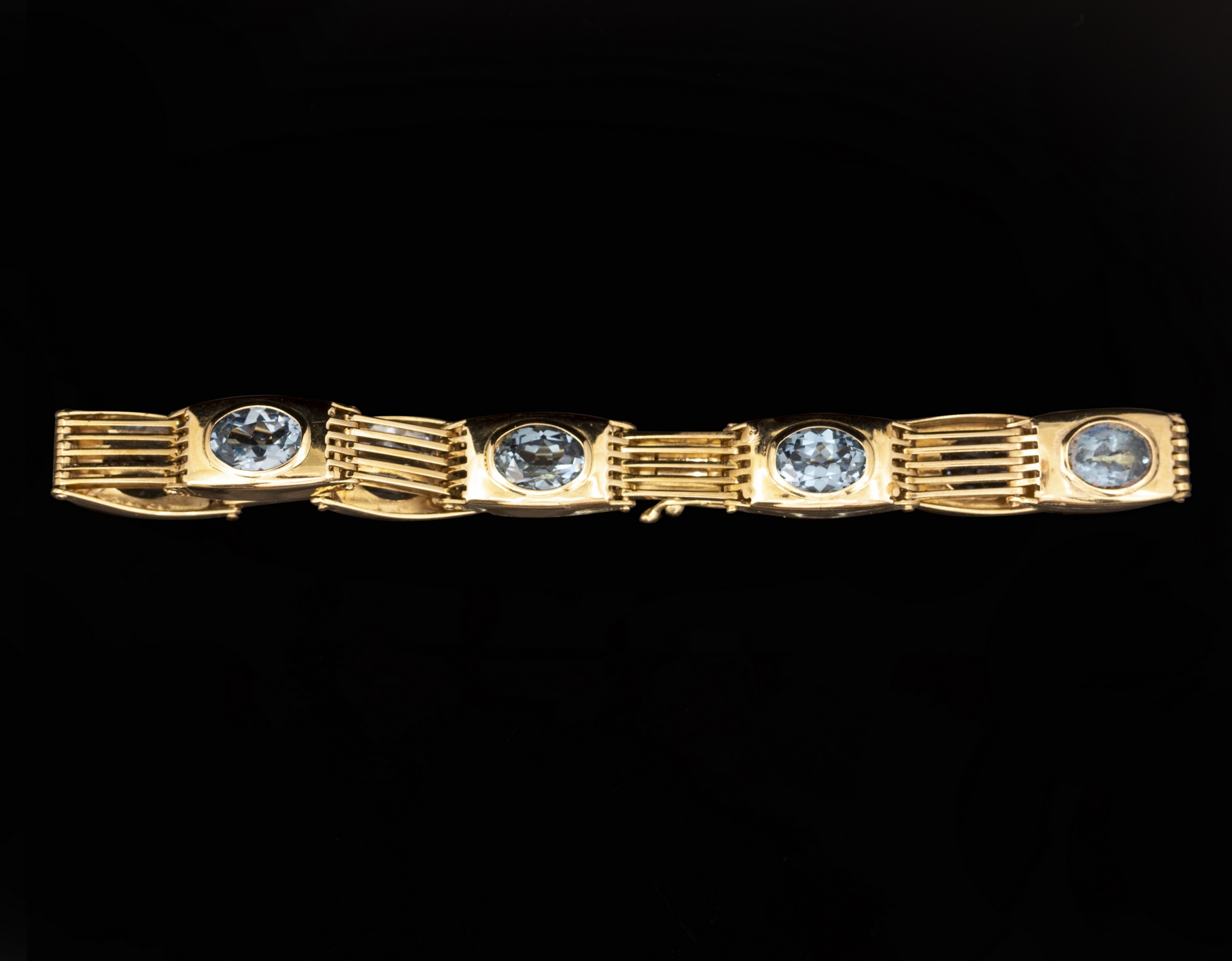 צמיד זהב 14K עשוי חוליות משובץ אבנים בצבע תכלת (8X6 מ”מ). אורך: 19 ס”מ. רוחב: 8 מ”מ. משקל: 17.7 גרם. חתום.