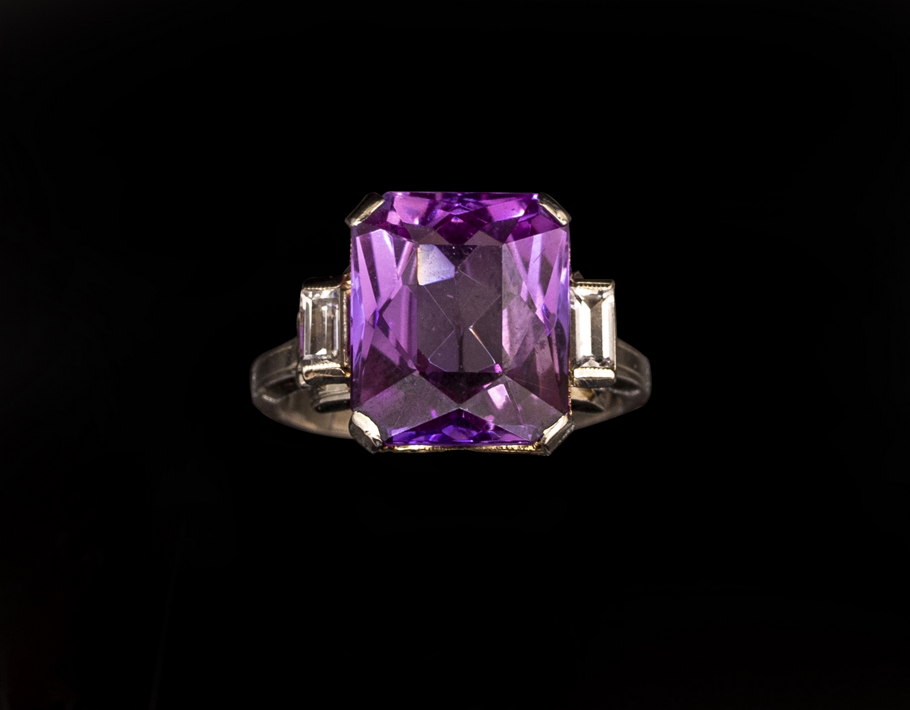 טבעת זהב 14K בשני גוונים. משובצת אמטיסט מרכזית (12X10 מ”מ) ושני יהלומי בגט (8 נק’ כ”א). מידה: 5 US, משקל: 5 גרם. חתומה.