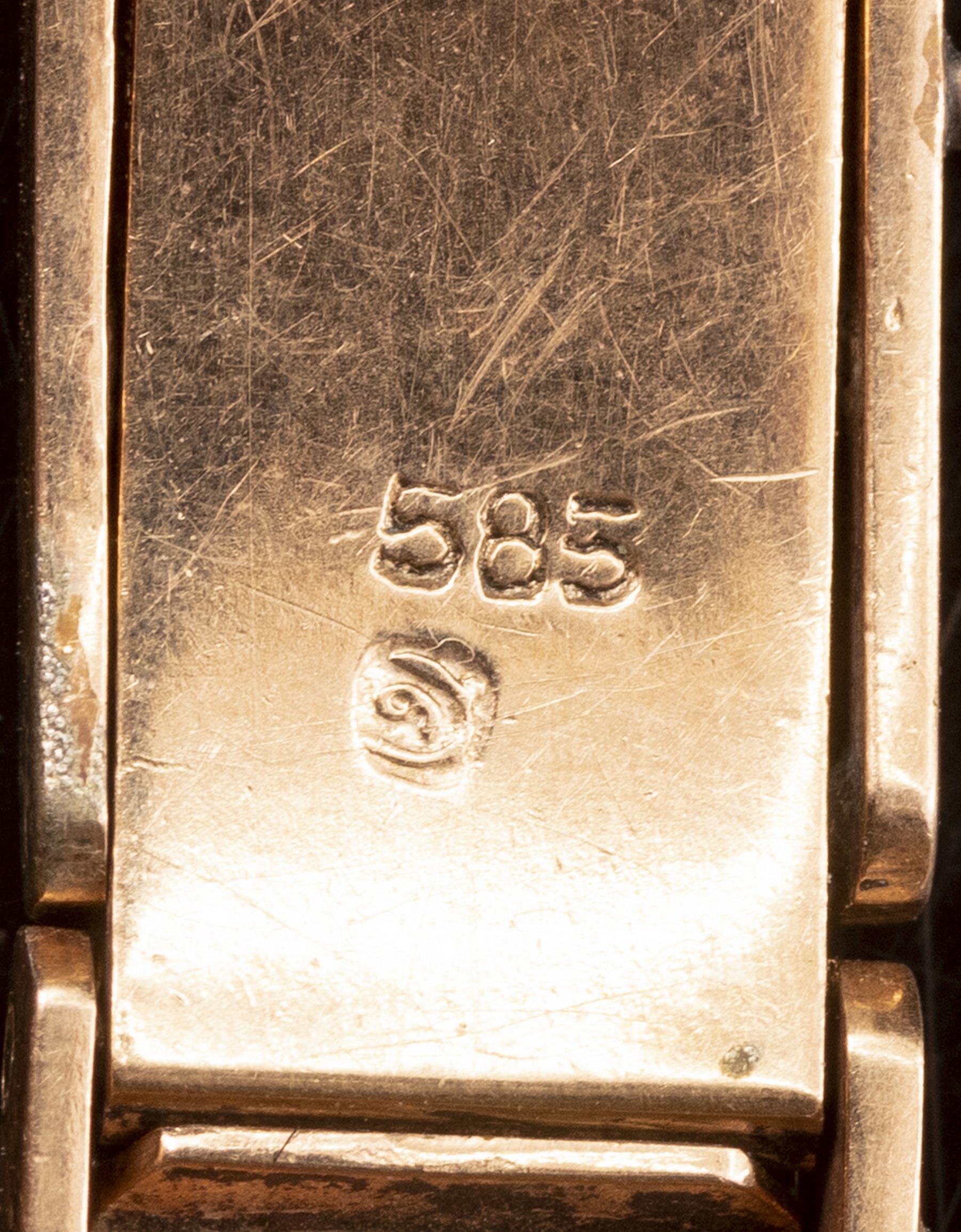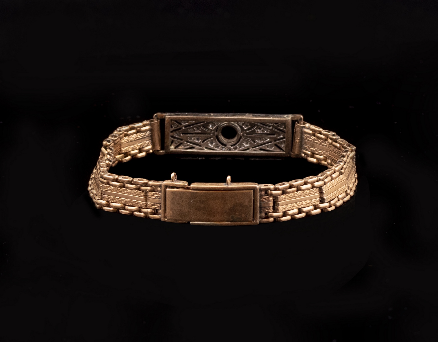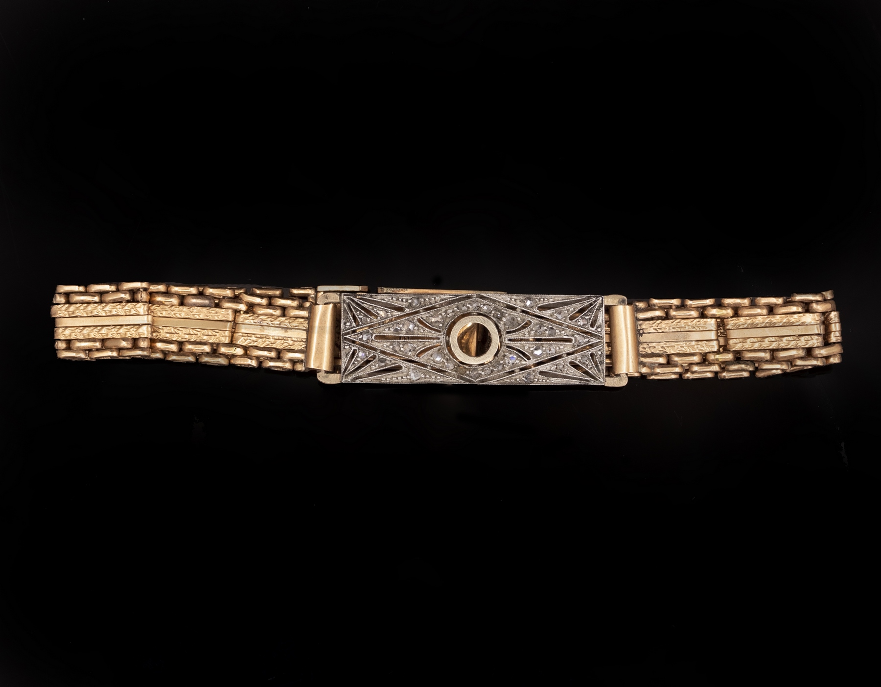 צמיד זהב 14K עשוי חוליות, המדליון המרכזי משובץ דיאמנטים זעירים (תושבת כסף) ומקום לשיבוץ אבן מרכזית. אורך: 18 ס”מ., רוחב מקסימלי: 10 מ”מ. משקל: 17.8 גרם. חתום.