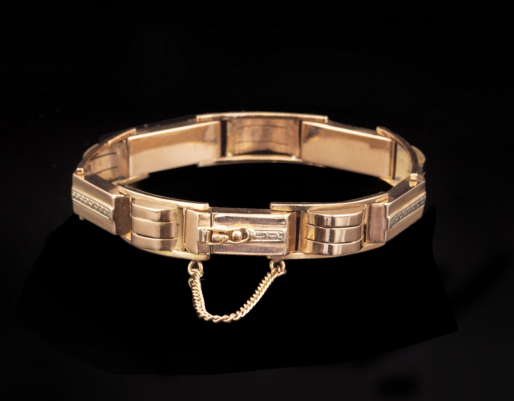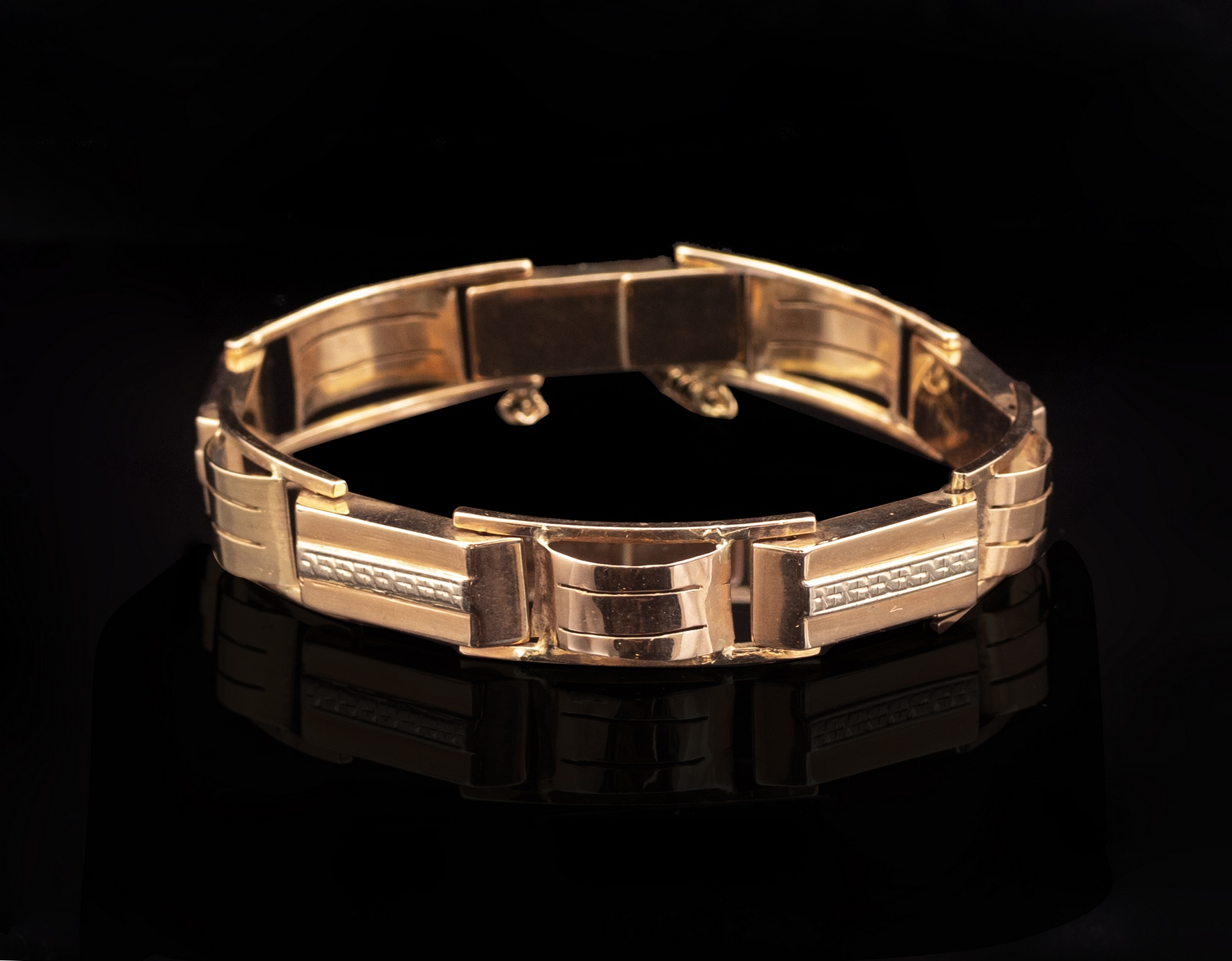 צמיד זהב 14K עשוי חוליות משולב זהב לבן ומעוטר בחריטות. אורך: 18 ס”מ. רוחב: 10 מ”מ. משקל: 22 גרם. חתום.