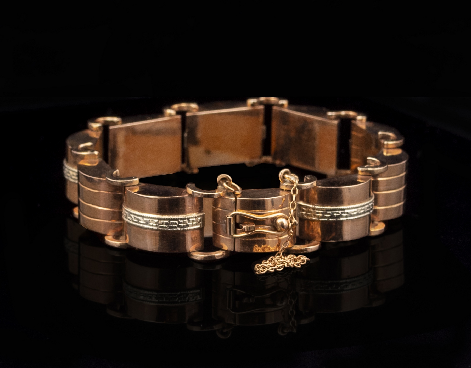 צמיד זהב 14K עשוי חוליות משולב זהב לבן. אורך: 17.5 ס”מ. רוחב: 13 מ”מ. משקל: 26.8 גרם. חתום. שרשרת ביטחון מנותקת.