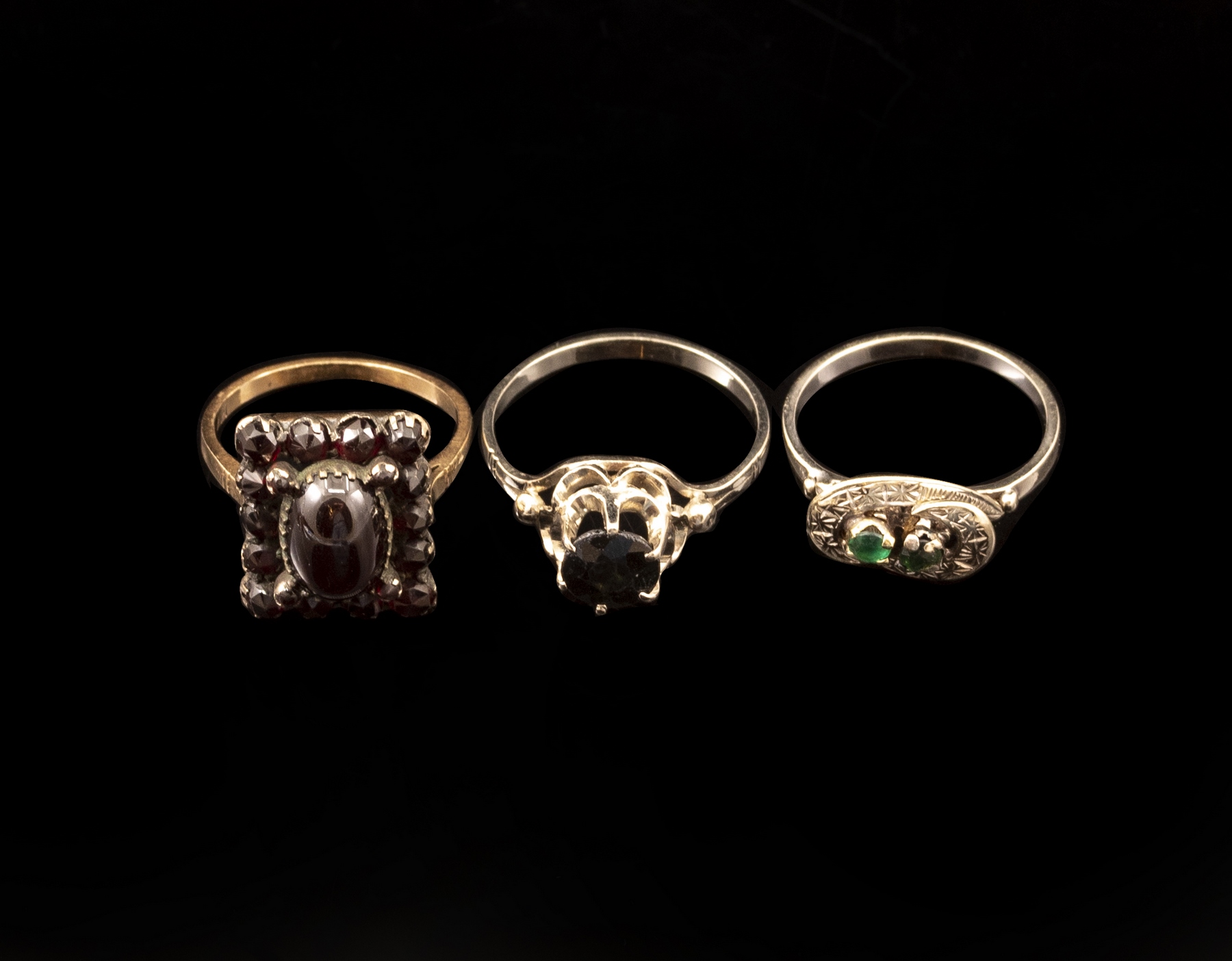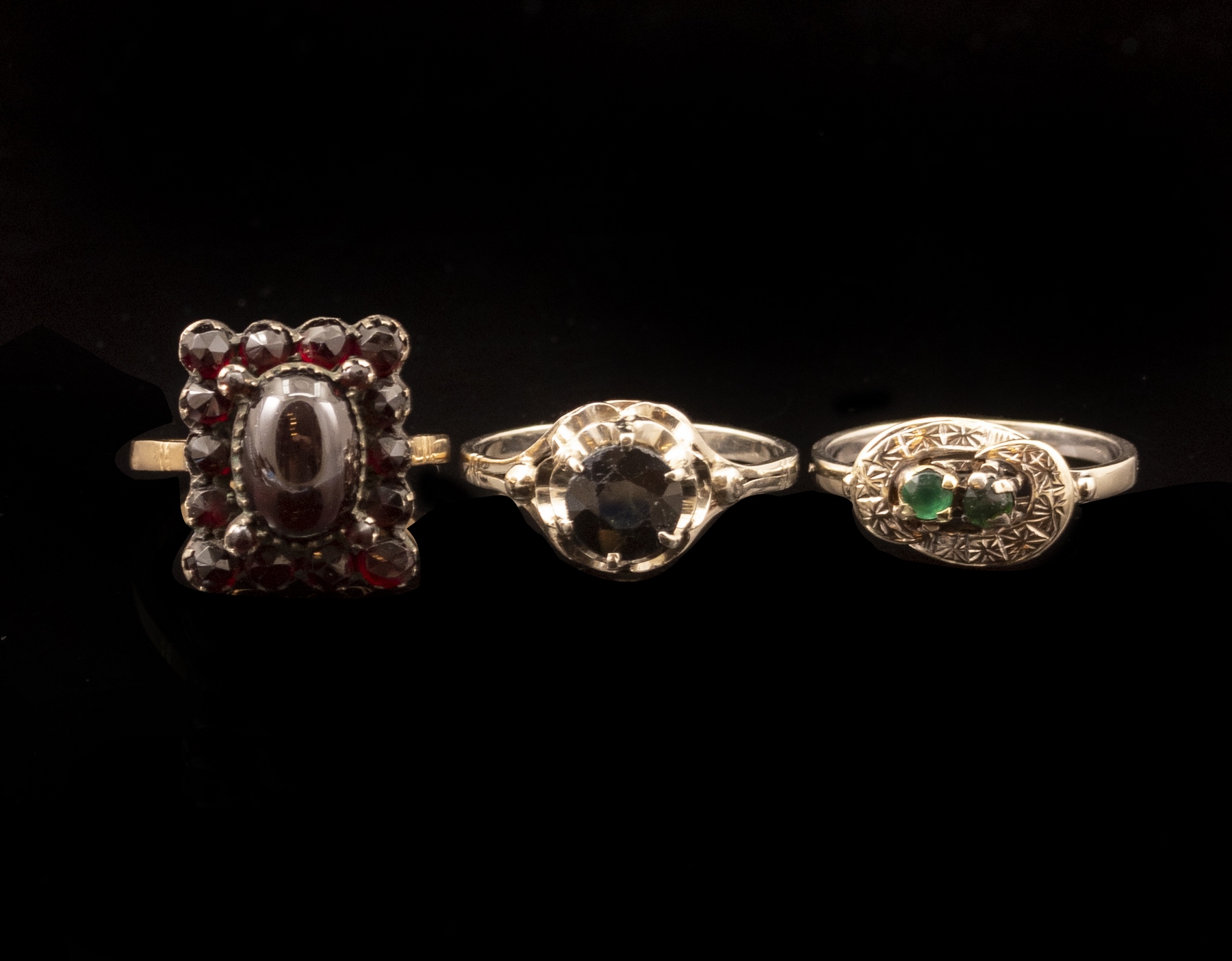 לוט 3 טבעות זהב 14K, כולל שתיים משובצות גרנטים ואחת משובצת אוניקס. מידות: 6.5-8 US, משקל: 9.6 גרם. לא חתומות, הזהב נבדק.