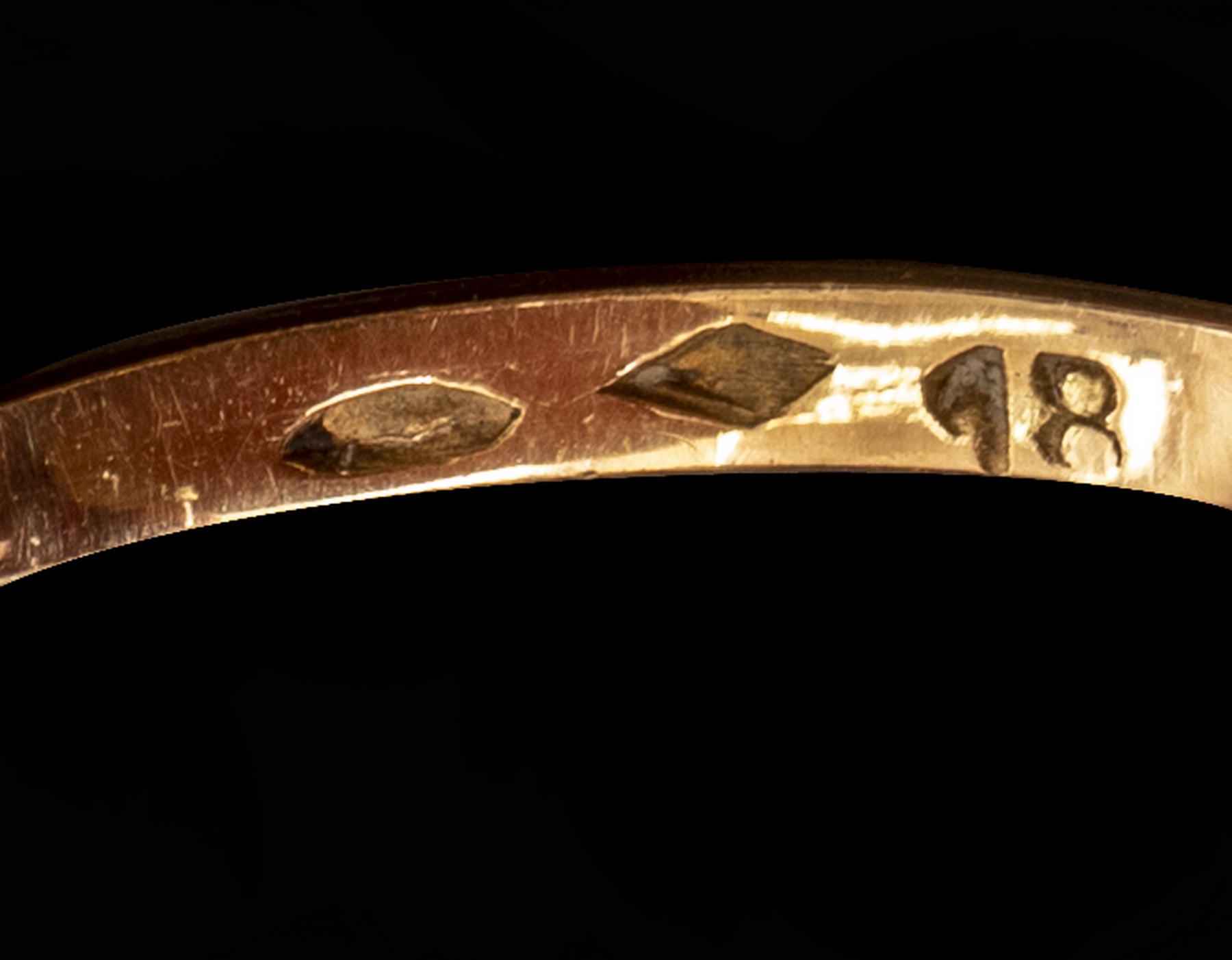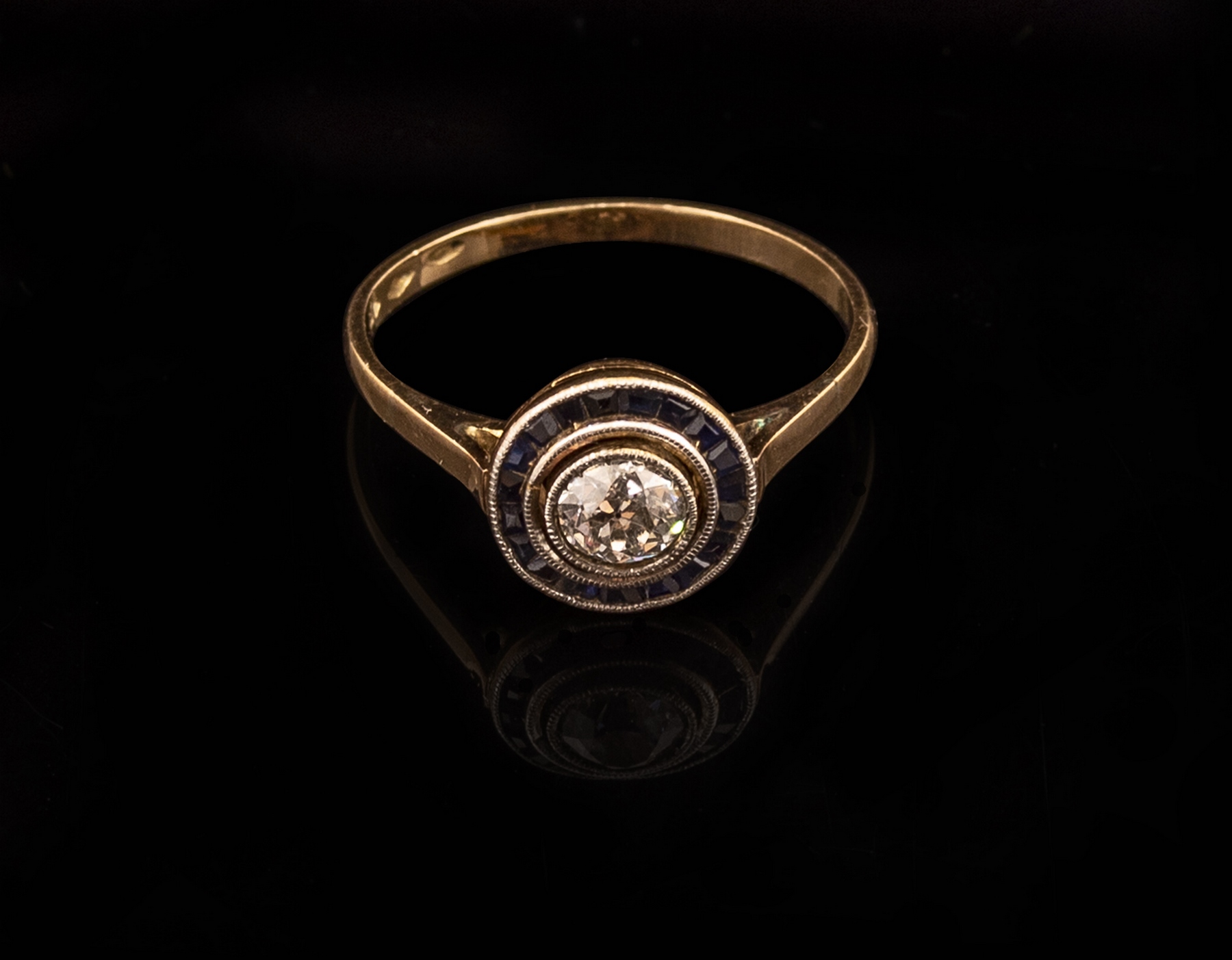 French Art-Deco 18K gold ring. Set with a central diamond (old cut) surrounded by sapphires. Size: US 7, Weight: 2.6 grams. Hallmarked.
