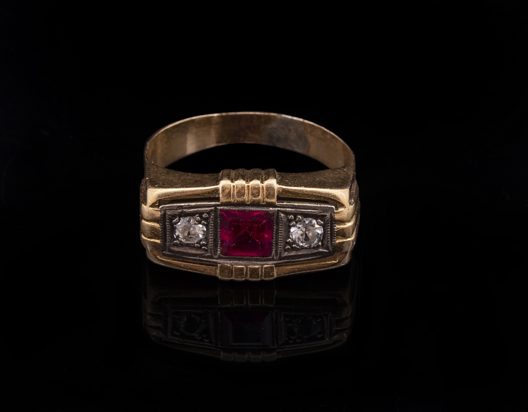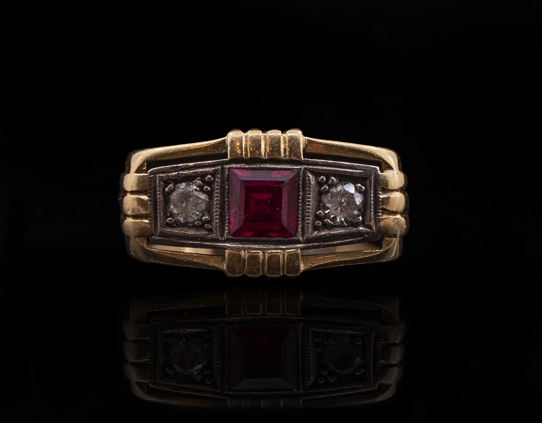 טבעת זהב 18K, משובצת רובי (5X5 מ”מ) ושתי אבנים שקופות. מידה: 3/4 9 US, משקל: 4.5 גרם. חתומה בחותמות יבוא צרפתיות.