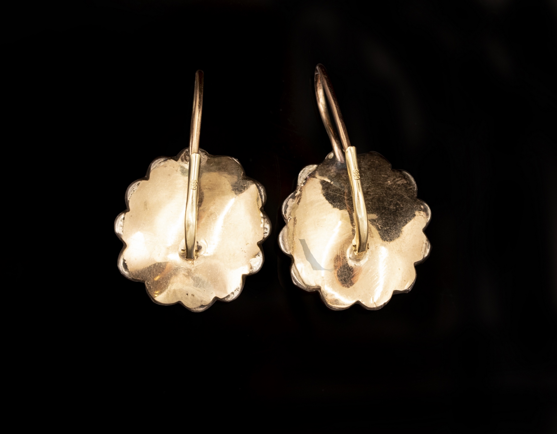 זוג עגילי זהב 14K וכסף בצורת פרח. משובצים דיאמנטים (המרכזי בקוטר 7 מ”מ). אורך: 19 מ”מ. משקל: 9.8 גרם. חתומים.