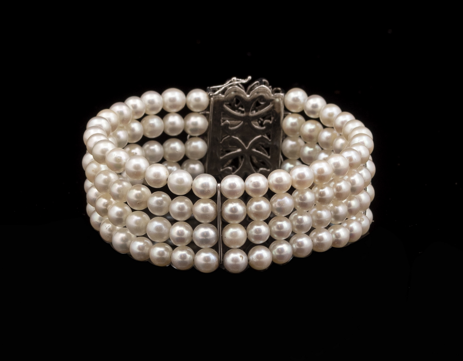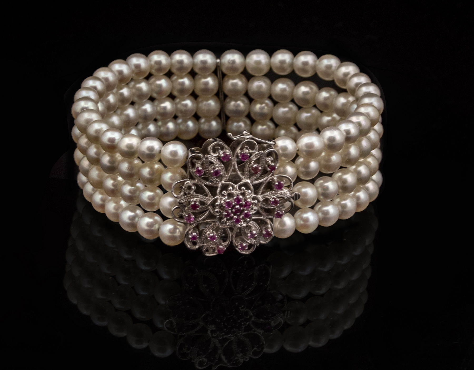 צמיד פנינים 4 שורות עם סוגר מזהב לבן 18K משובץ כ-24 רובינים זעירים. קוטר פנימי: 60 מ”מ. רוחב: 22 מ”מ. קוטר הפנינים: 6 מ”מ. משקל כולל: 45 גרם. חתום.