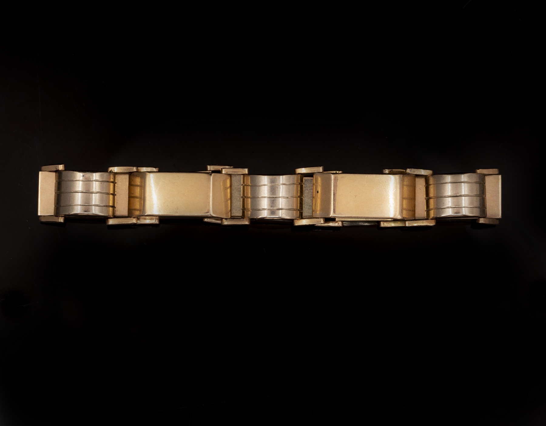 צמיד זהב 14K עשוי חוליות. אורך: 18.5 ס”מ, רוחב: 11 מ”מ. משקל: 21.2 גרם. חתום.