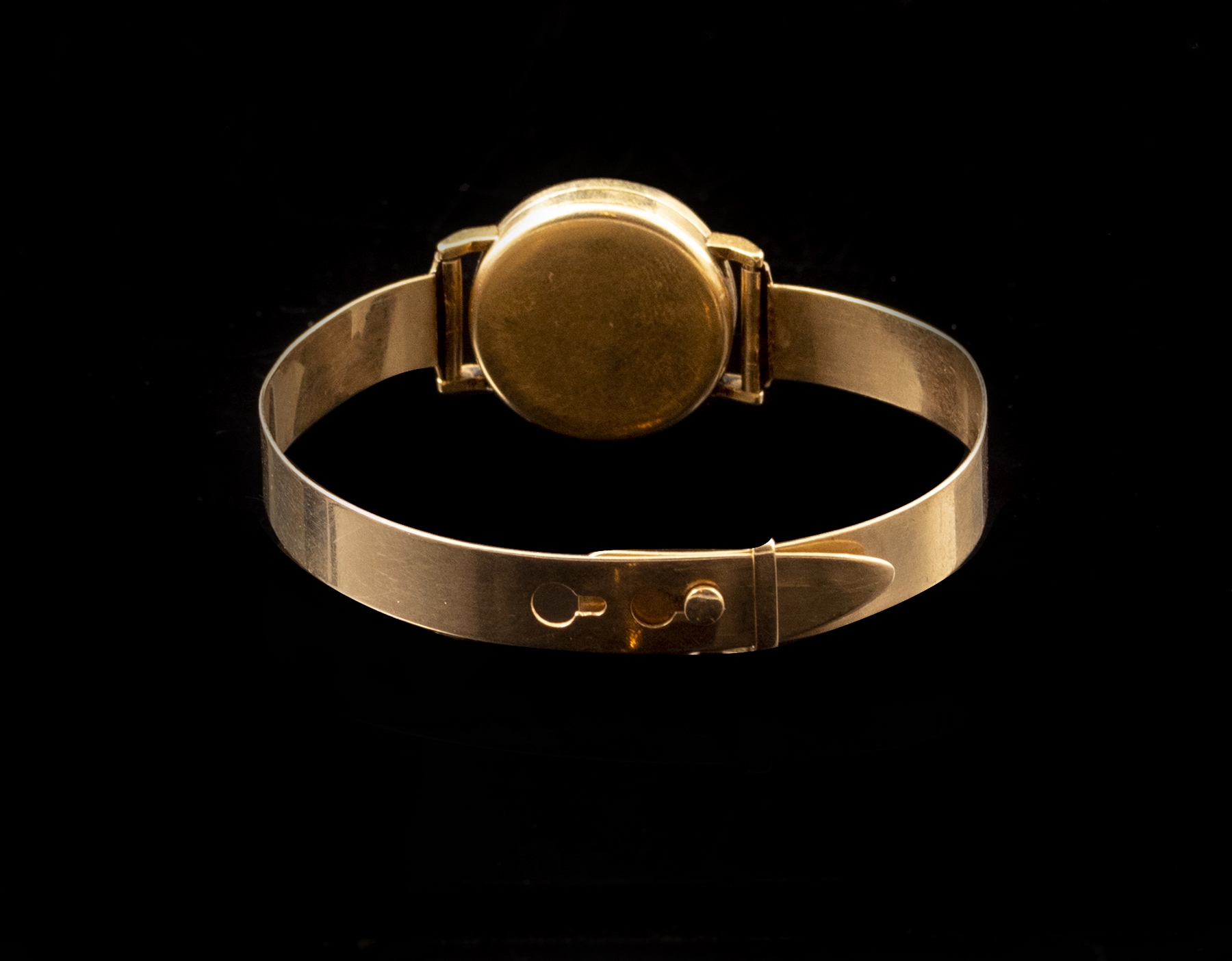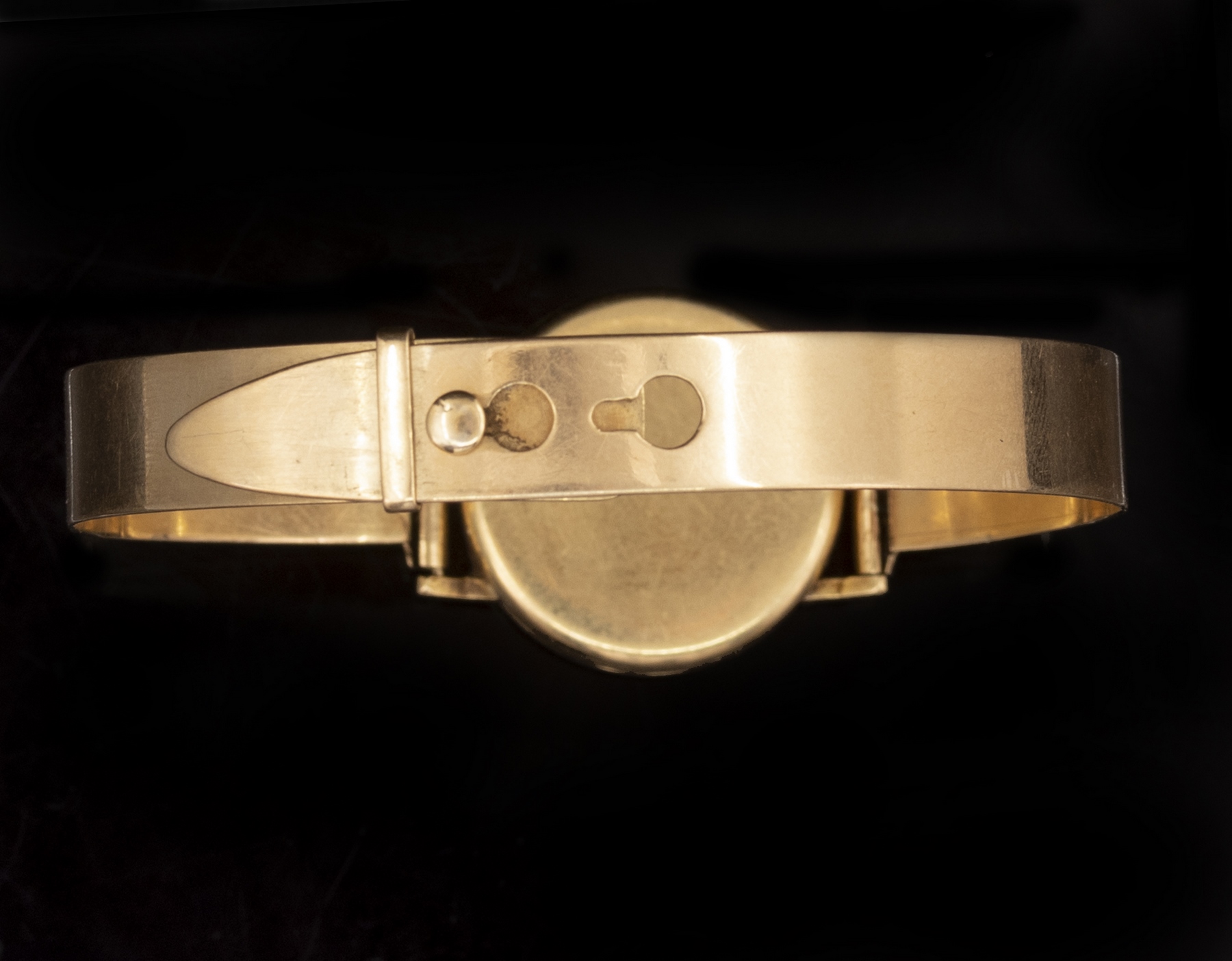 צמיד זהב 14K שהוסב משעון יד, במקום מנגנון השעון שובצה אבן חן כחולה. רצועת השעון עשויה זהב 14K (לא חתום, זהב נבדק) מסגרת השעון עשויה זהב 18K (חתום). משקל נטו (ללא האבן): 13 גרם, קוטר מקסימלי: 5.7 ס"מ, קוטר האבן: 1.9 ס"מ.
