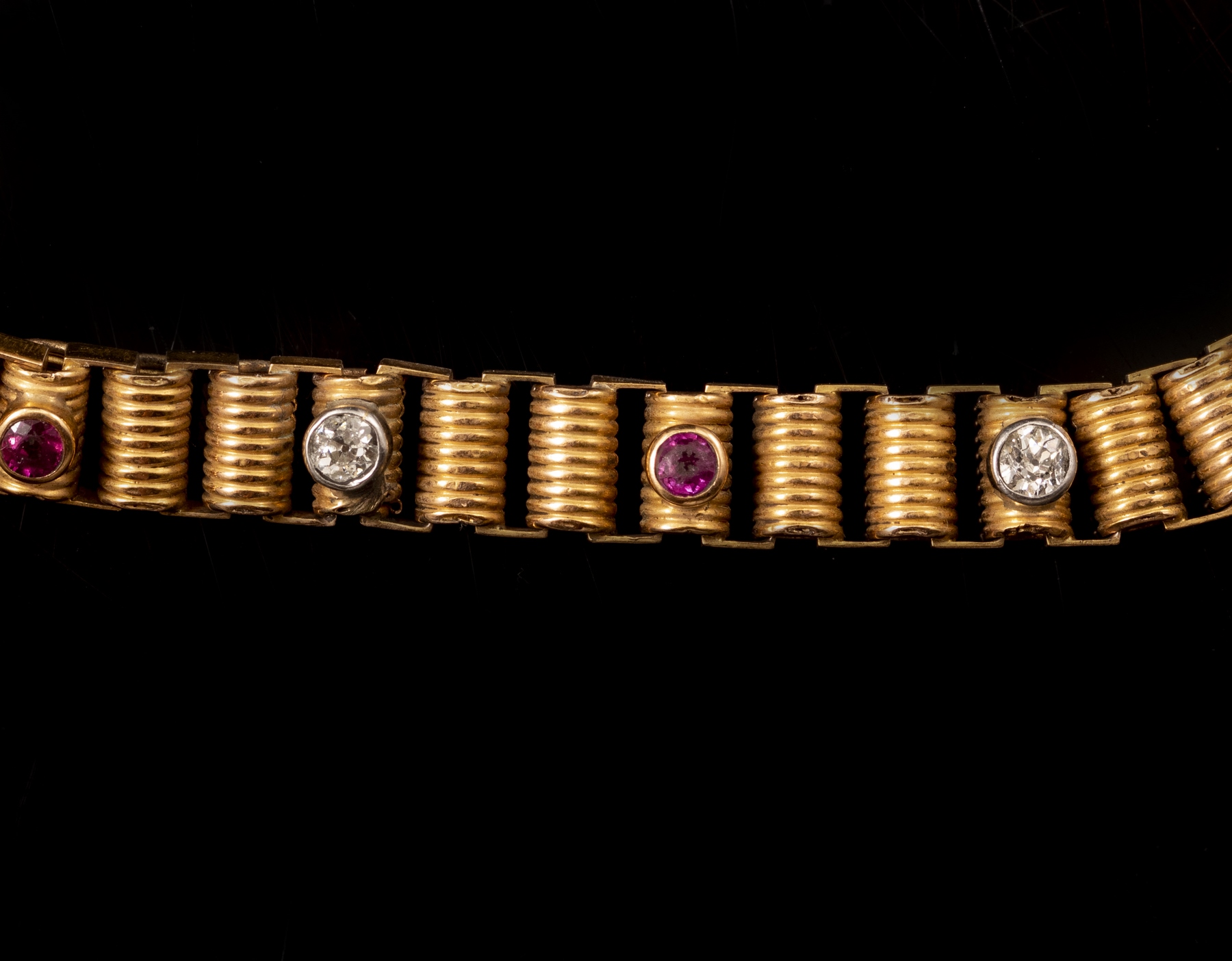 צמיד זהב 18K עתיק, משובץ 4 יהלומים בחיתוך אלט-שליף במשקל כולל של כ-10 נק’ כ”א ו-3 אמרלדים. אורך: 16 ס”מ. רוחב: 7 מ”מ, משקל: 16 גרם. לא חתום, זהב נבדק. תיקונים ישנים.