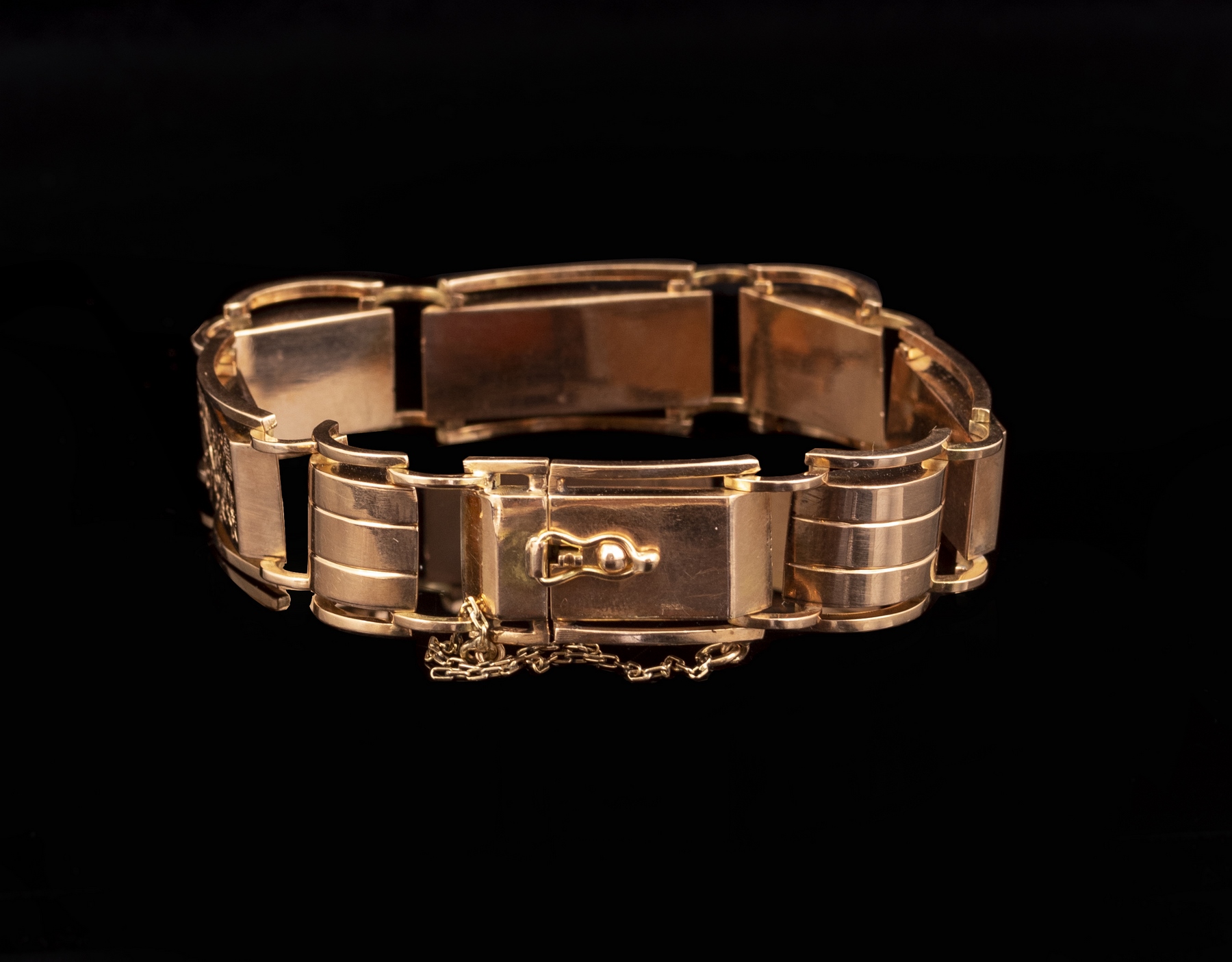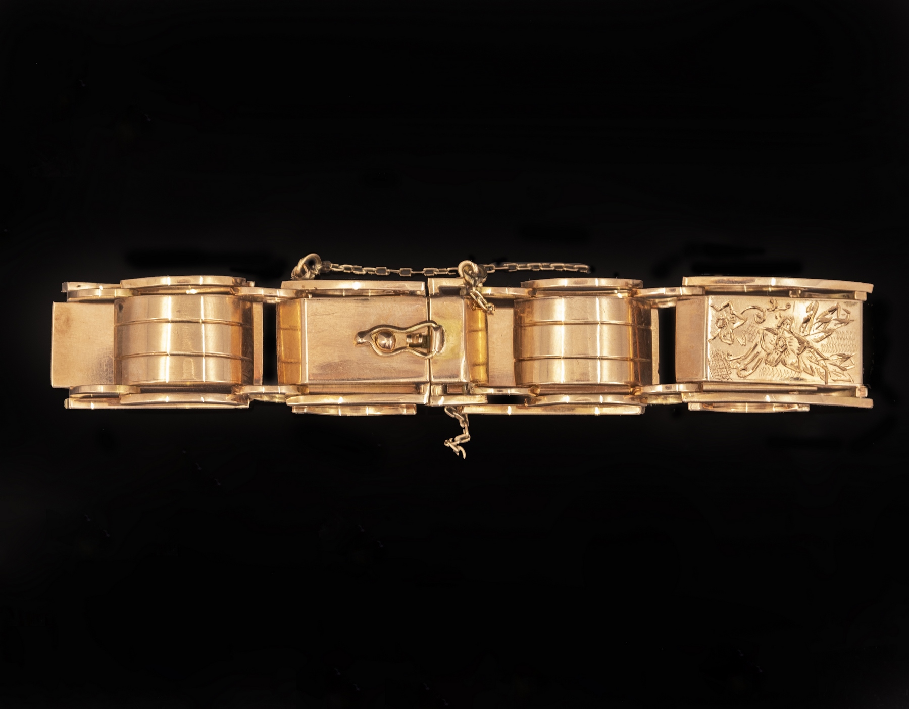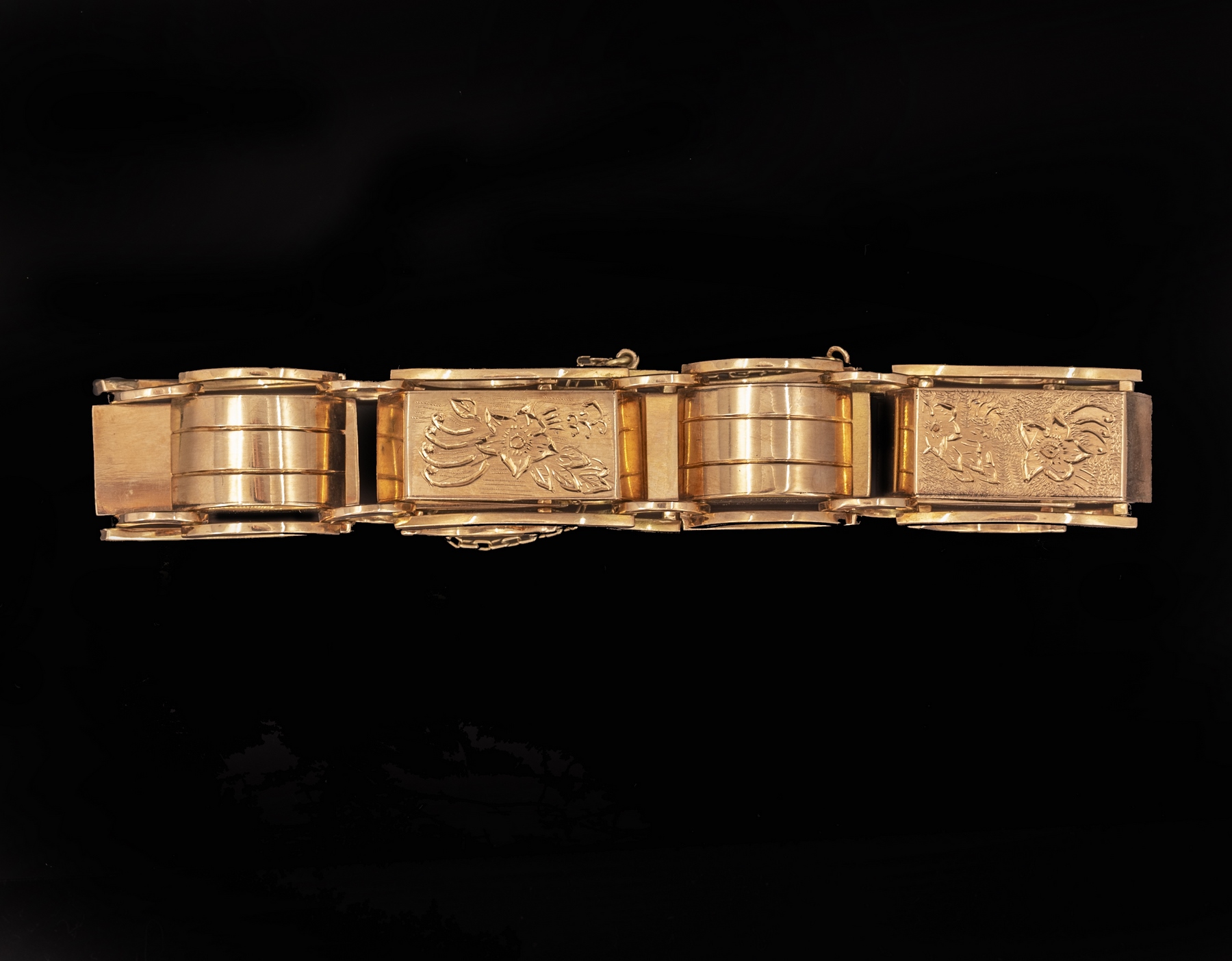 צמיד זהב 14K עשוי חוליות מעוטר בחריטות. אורך: 18.5 ס”מ. רוחב: 14 מ”מ. משקל: 30 גרם. חתום. שרשרת ביטחון מנותקת.