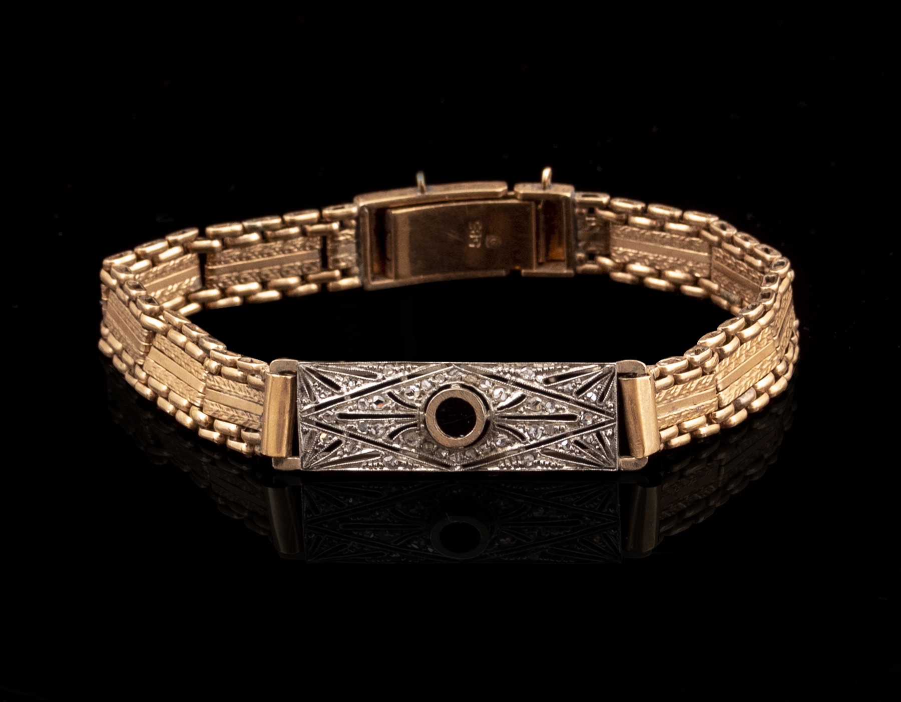 צמיד זהב 14K עשוי חוליות, המדליון המרכזי משובץ דיאמנטים זעירים (תושבת כסף) ומקום לשיבוץ אבן מרכזית. אורך: 18 ס”מ., רוחב מקסימלי: 10 מ”מ. משקל: 17.8 גרם. חתום.