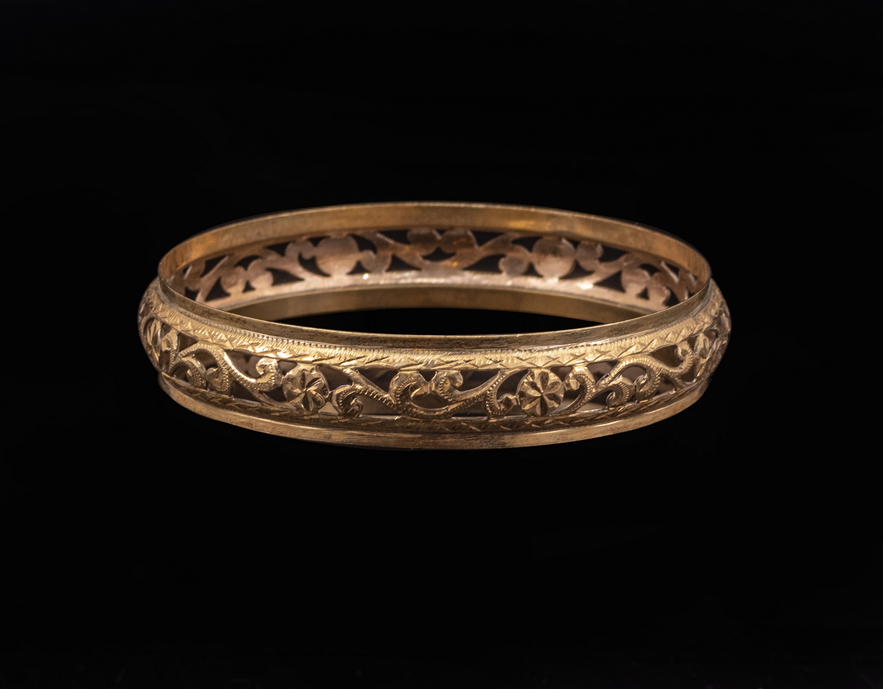 צמיד זהב 14K מעוטר עבודה פתוחה עם מוטיבים צמחיים. קוטר פנימי: 70 מ”מ, רוחב: 14 מ”מ. משקל: 18.4 גרם. חתום.