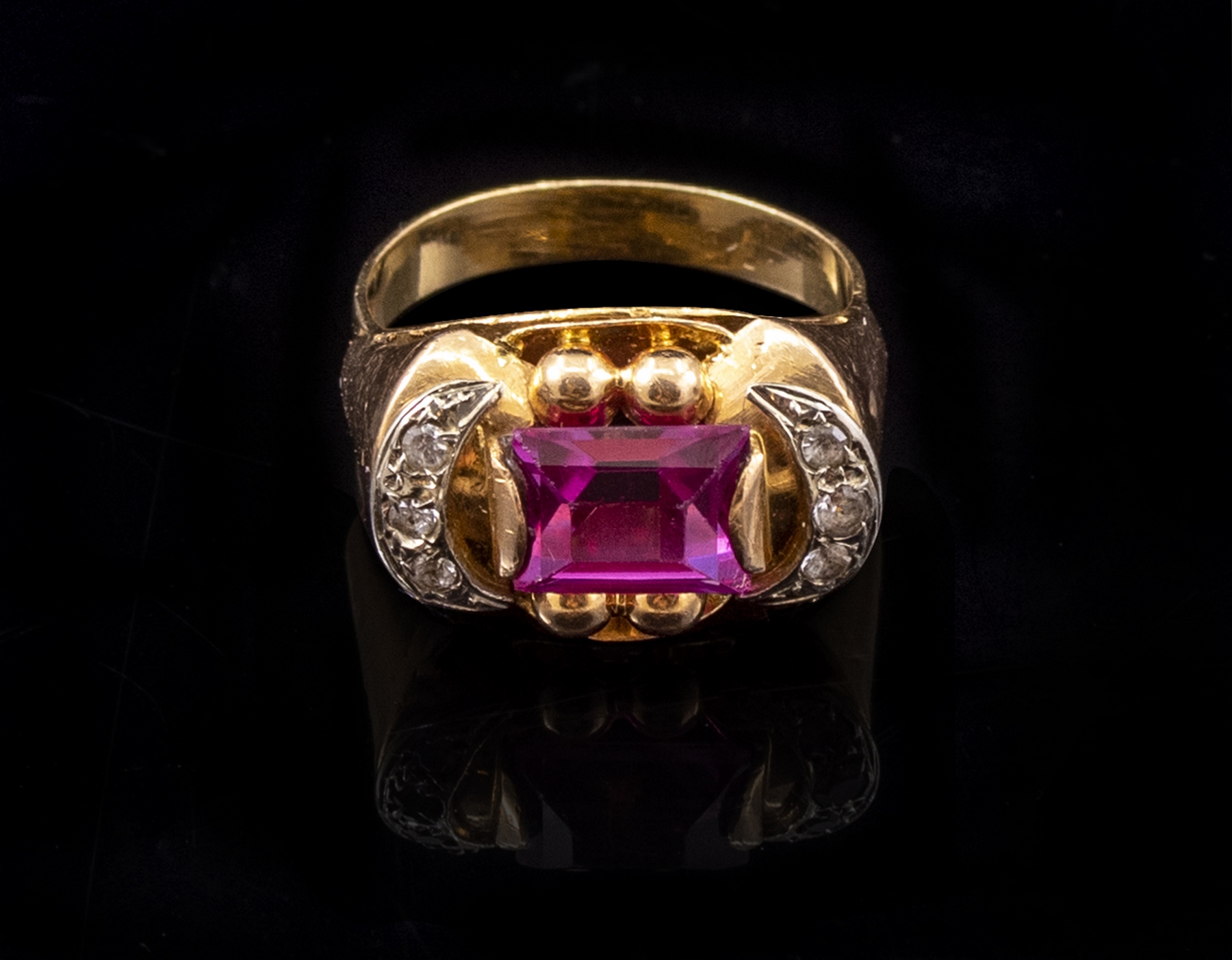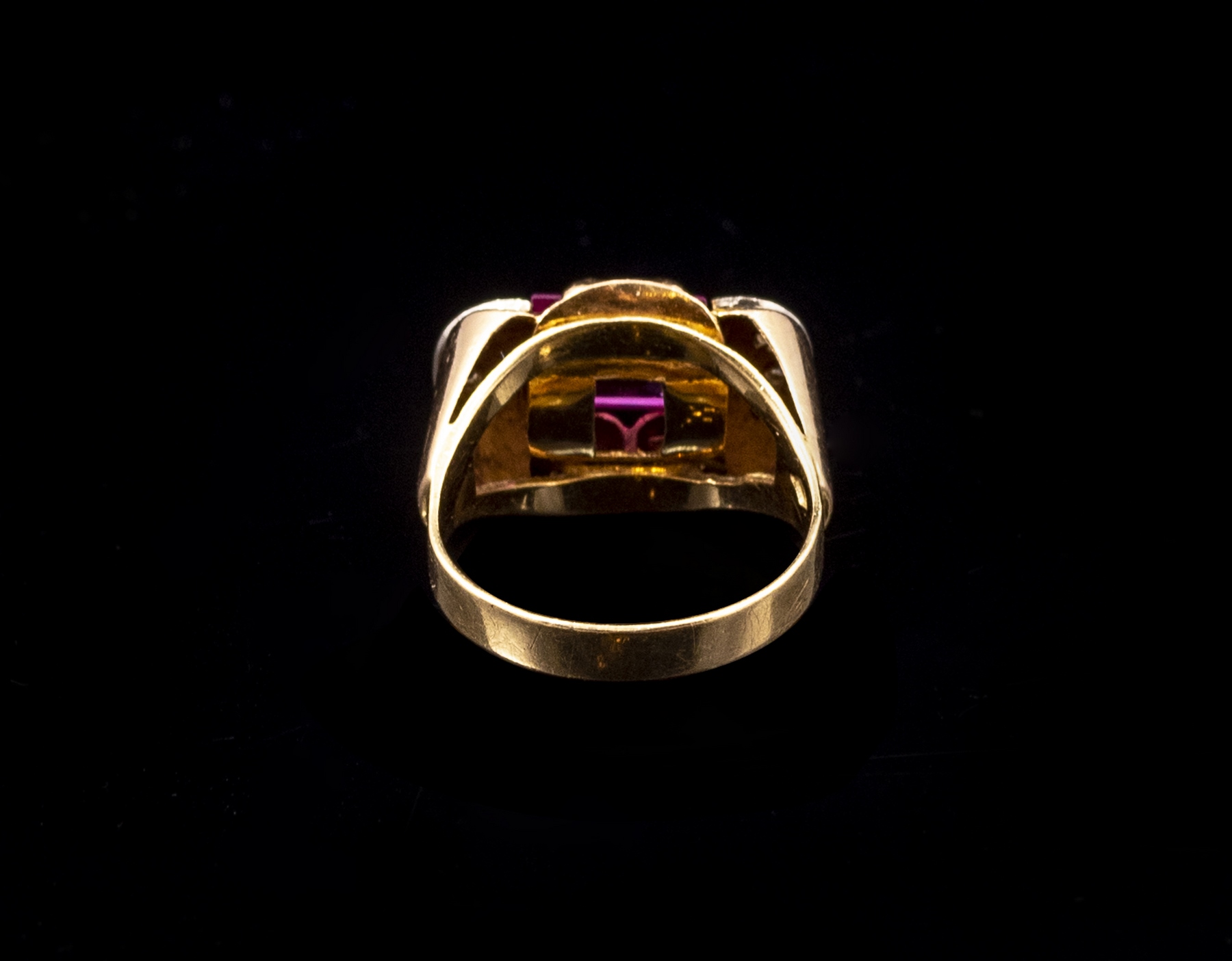 18K gold ring set with a central red gemstone. Size: US 6, Weight: 4.4 grams. Hallmarked.