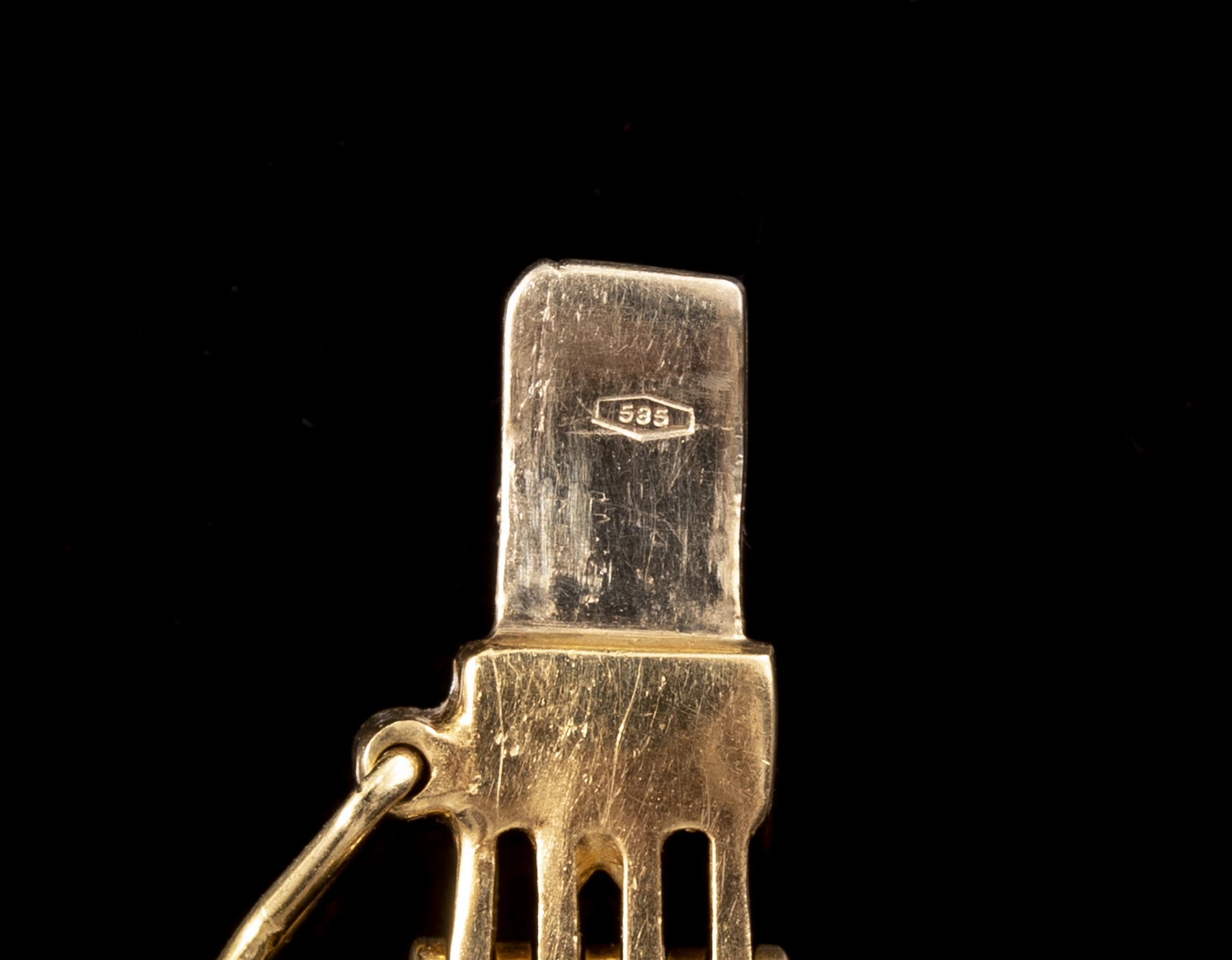 14k gold bracelet set with light blue stones. Length: 19 cm, width: 8 mm, weight: 17.7 grams. Hallmarked